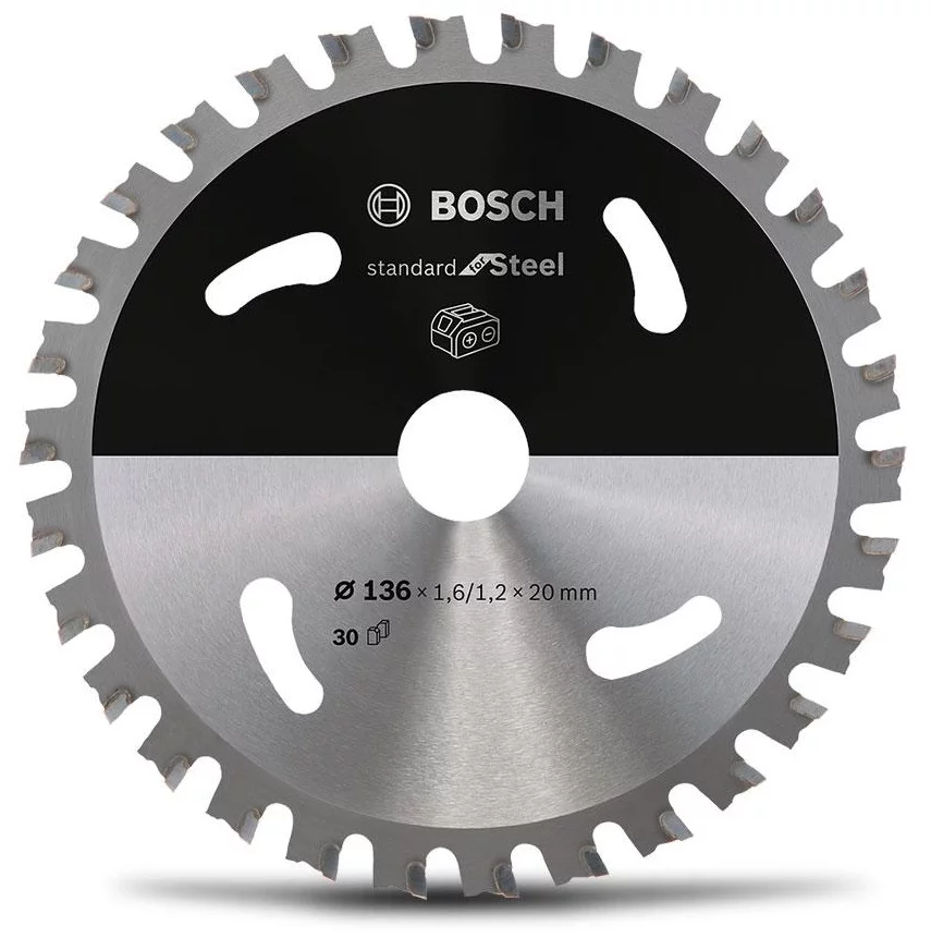 Диск пиляльний Bosch Standard for Steel 136x1.6x20 мм з 30 зубами (30HB) призначений для різання сталі в акумуляторних циркулярних пилах. Товщина 1.6 мм з розрідженням 1.2 мм забезпечує плавний пропив без заїдання. Посадковий діаметр 20 мм сумісний з інструментами Bosch. Цей елемент оптимізує роботу з металом для чистих зрізів. Матеріал з твердосплавними зубами стійкий до зносу.