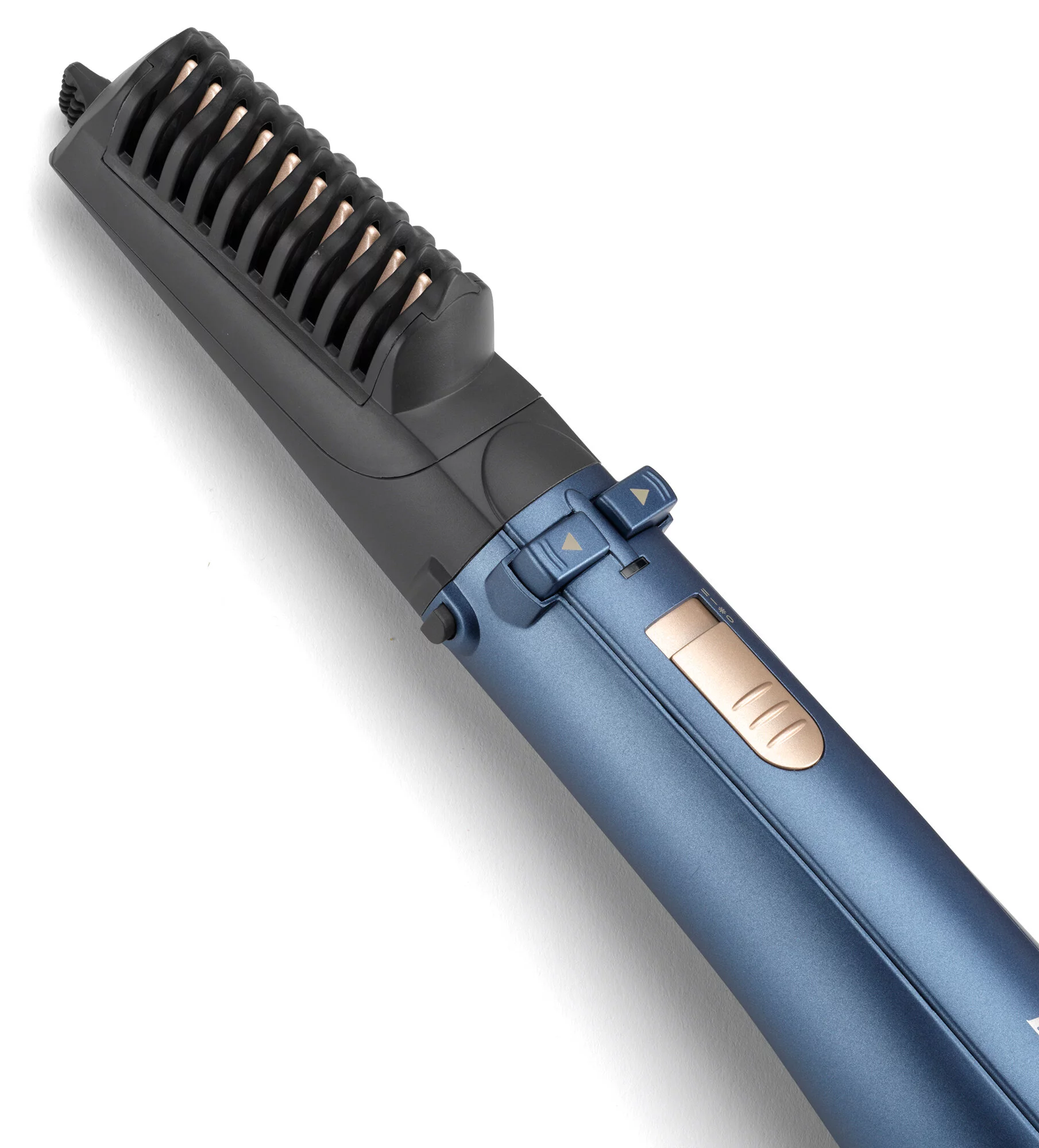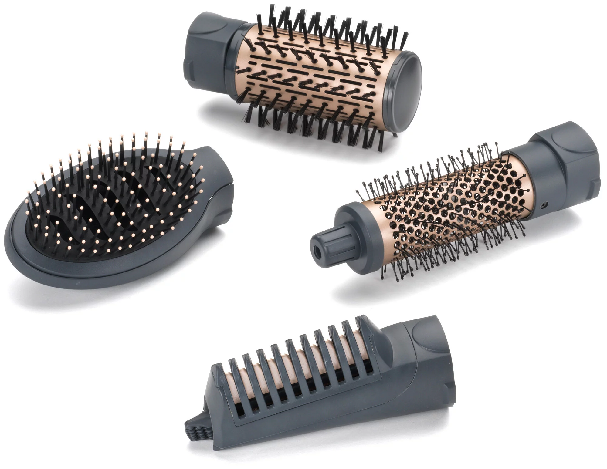 Фен-щітка Babyliss Style Pro 4-в-1 з потужністю 1000 Вт, іонізацією та 4 насадками: обертальна щітка Ø50 мм, кругла керамічна Ø38 мм, насадка для випрямлення та розгладжувальна щітка. Два рівні температури, холодне повітря, обертальний шнур 2,2 м і чохол у комплекті.