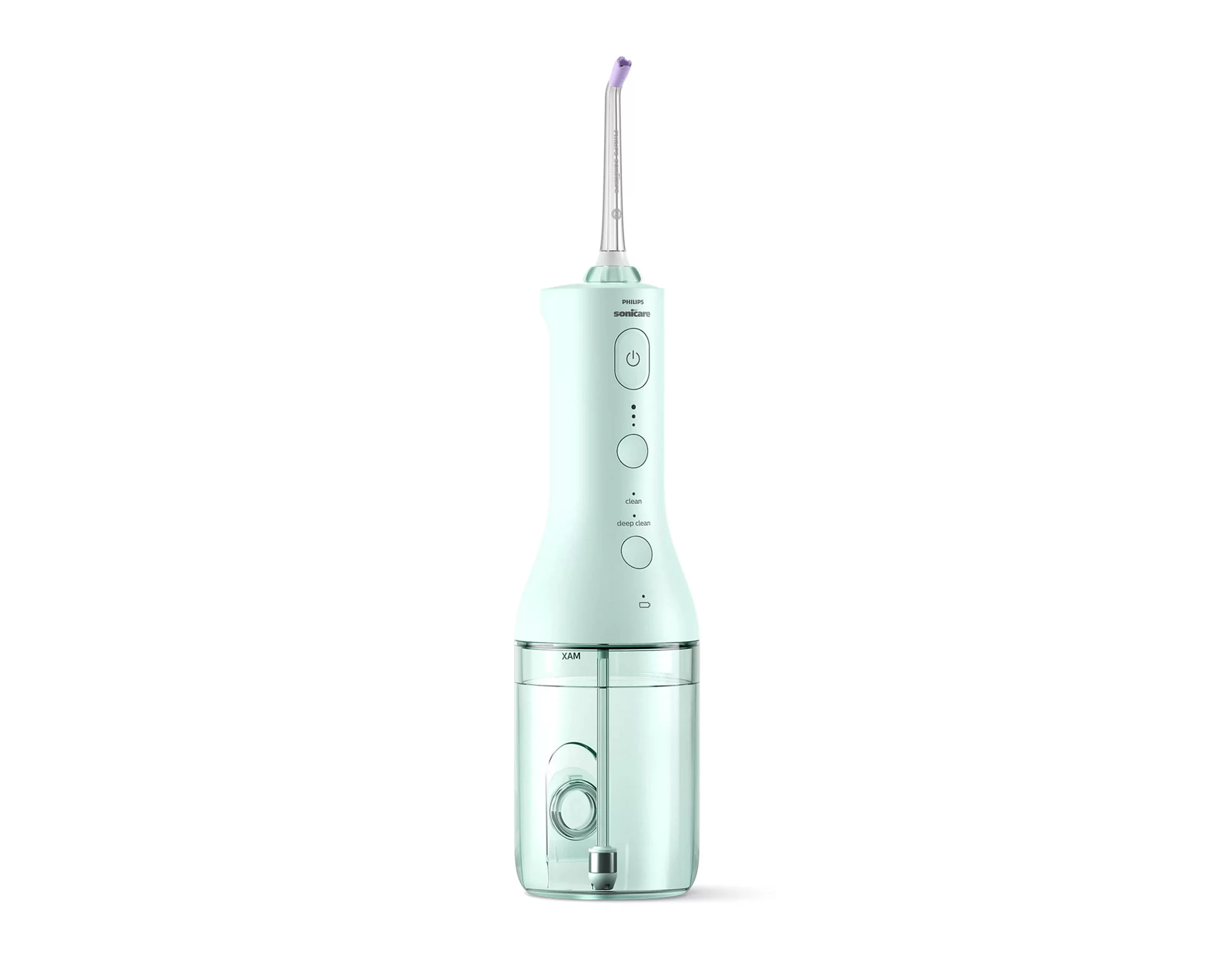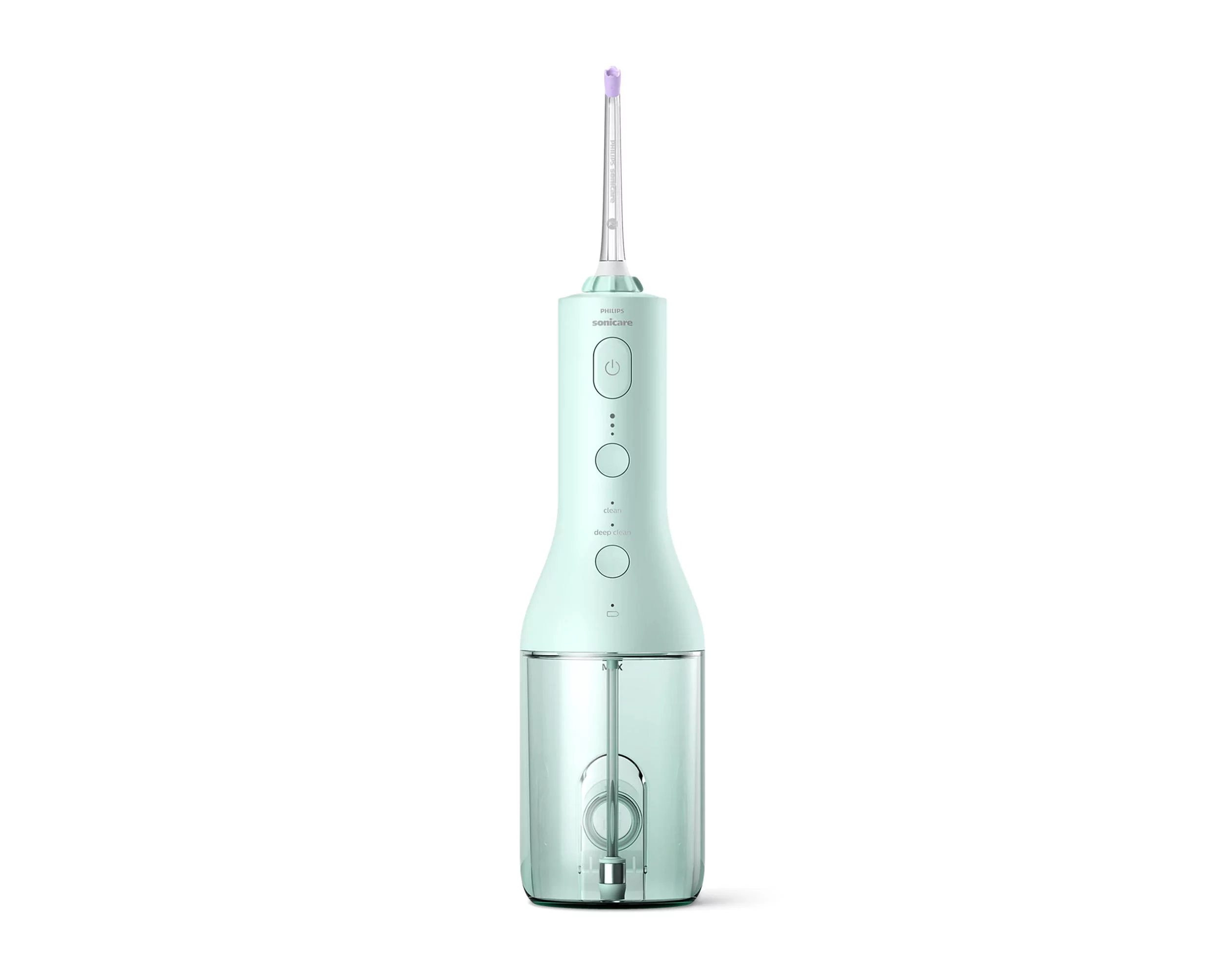 Портативний іригатор Philips Sonicare Cordless Power Flosser 3000 забезпечує ефективне очищення міжзубних проміжків завдяки потужним пульсуючим струменям води. Оснащений двома режимами роботи та двома насадками, він підходить для щоденного догляду вдома чи у подорожі. Пристрій працює до двох тижнів без підзарядки й комплектується зручним чохлом для транспортування.