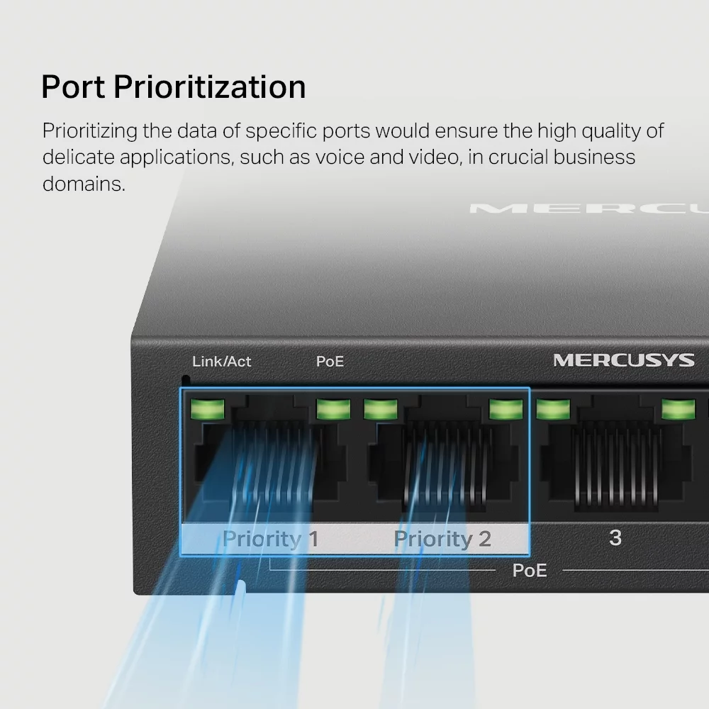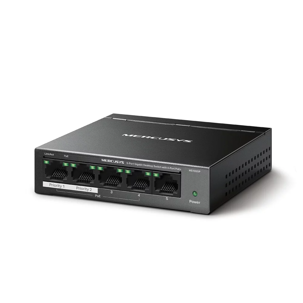 MERCUSYS MS105GP — некерований гігабітний комутатор з 5 портами (4 з підтримкою PoE+). Забезпечує сумарний бюджет живлення 65 Вт, до 30 Вт на порт. Підтримує розширений режим передачі до 250 м та режим ізоляції для безпечного розділення трафіку. Оснащений міцним металевим корпусом, простий у встановленні (Plug and Play).