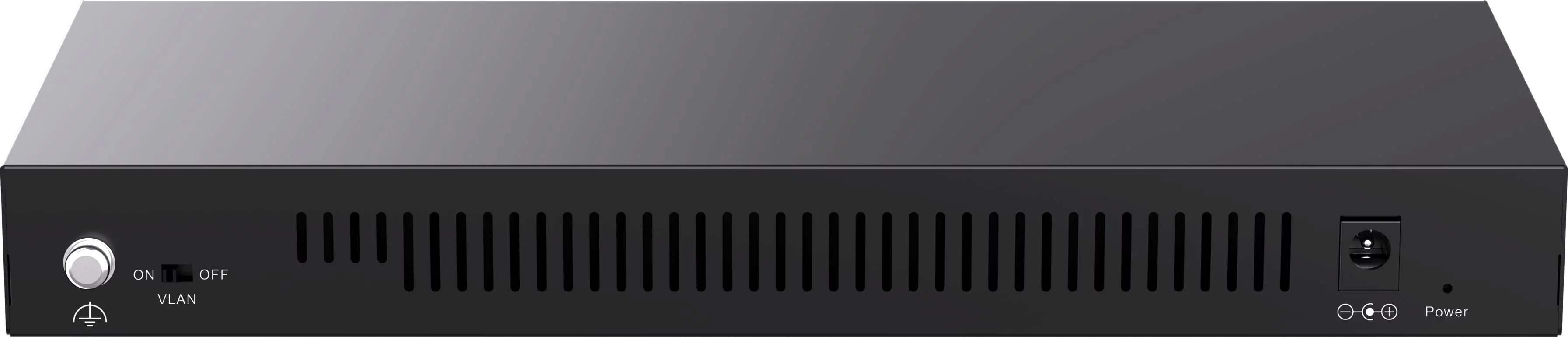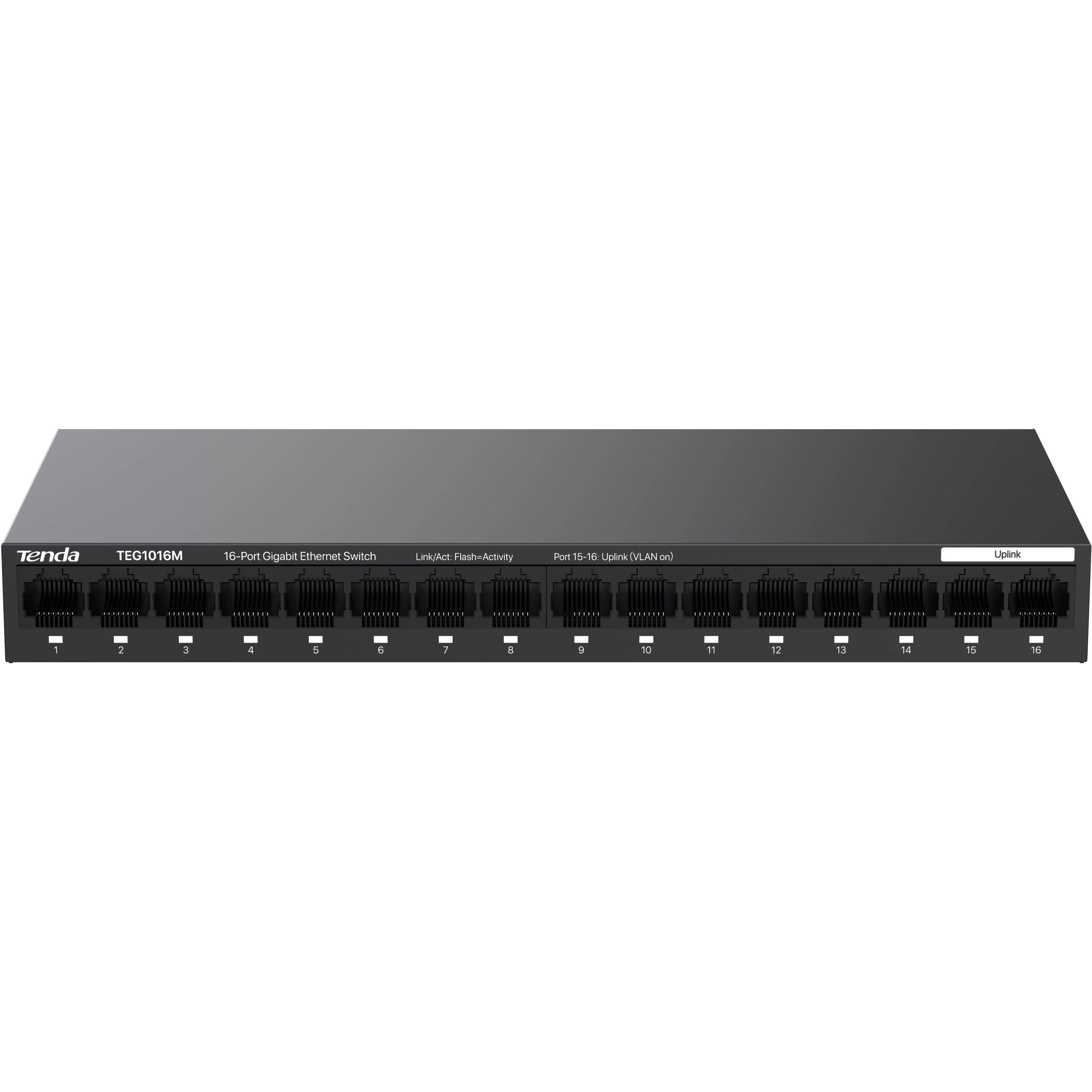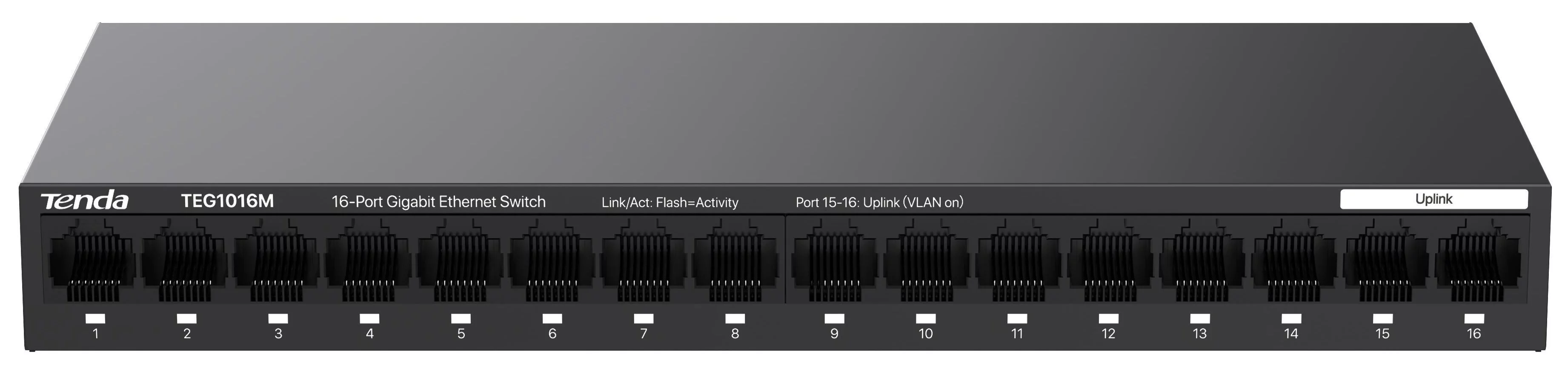 Некерований комутатор TENDA TEG1016M із 16 гігабітними портами Ethernet. Забезпечує пропускну здатність 32 Гбіт/с, має захист від блискавки до 6 кВ та підтримує функцію VLAN одним натисканням.