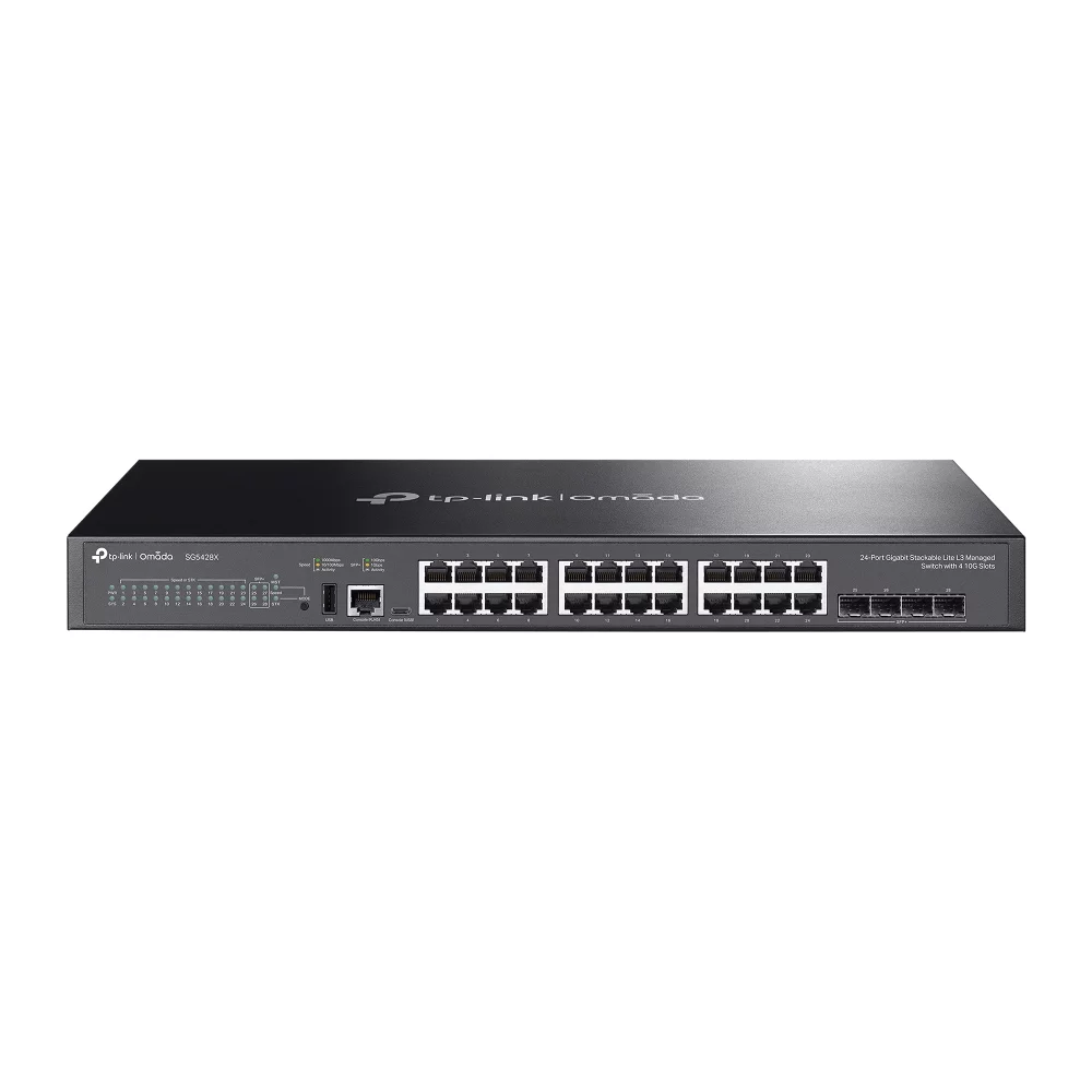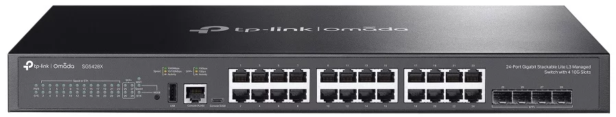 USB 2.0, 1 консольний порт RJ45, 1 консольний порт USB Type-C, 4 x SFP+, 24 x 10/100/1000 Мбіт/с RJ45