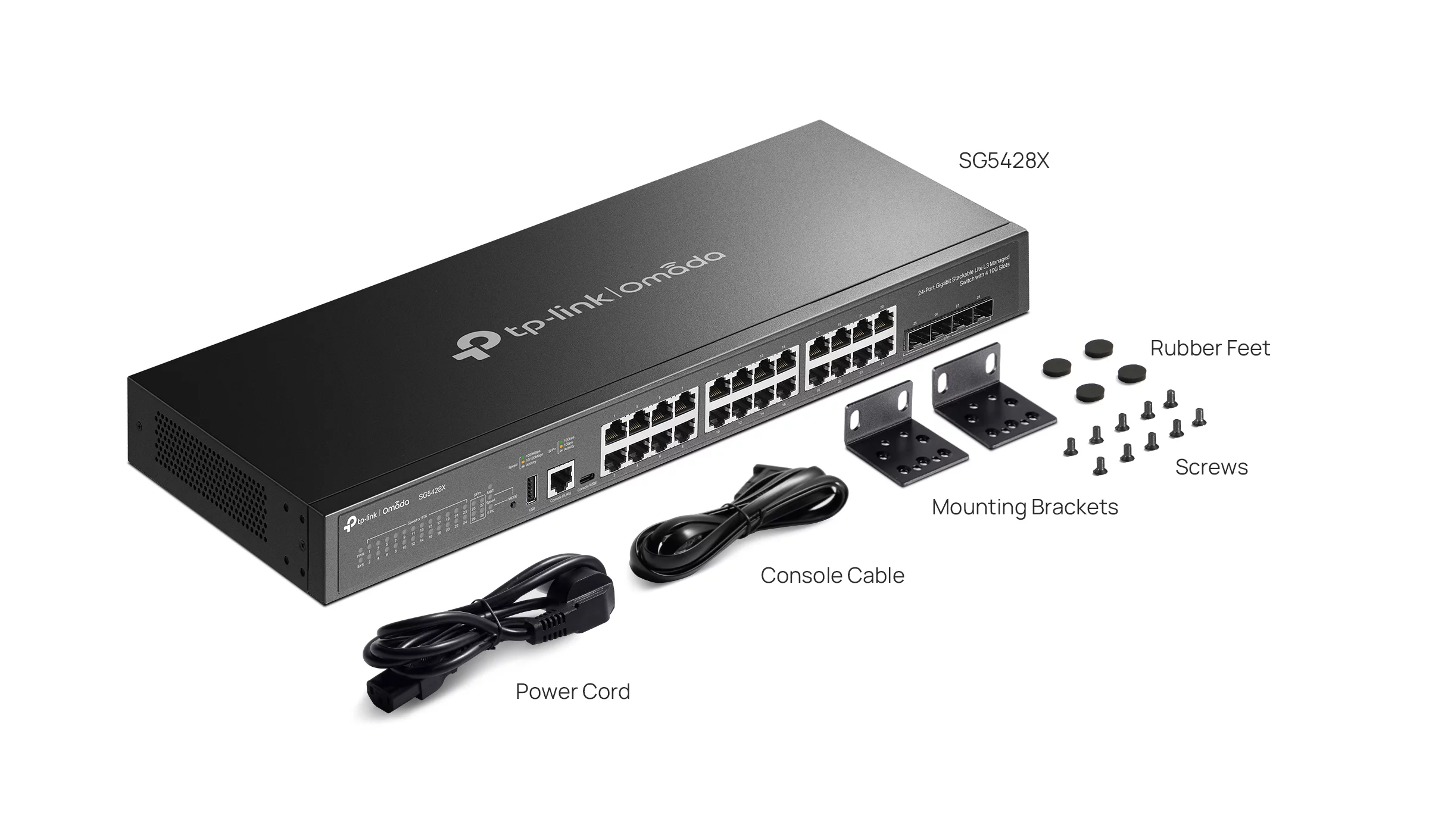 гумові ніжки, Комплекти для монтажу в стійку, Комутатор, Консольний кабель, Посібник зі швидкого встановлення, Шнур живлення