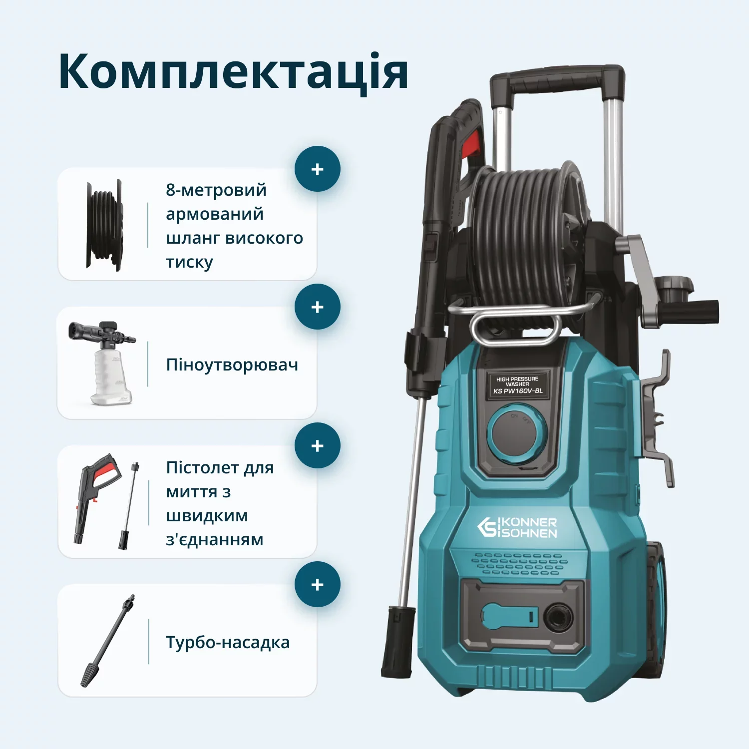 Мийка високого тиску Konner&Sohnen KSPW160V-BL — ефективний інструмент для очищення автомобіля, тротуарної плитки, фасадів, садового інвентаря та іншого обладнання. Її можна використовувати як у побуті, так і для напівпрофесійних завдань. Цей пристрій поєднує потужність, довговічність і зручність, дозволяючи досягати високого рівня чистоти за мінімальний час і зусилля.