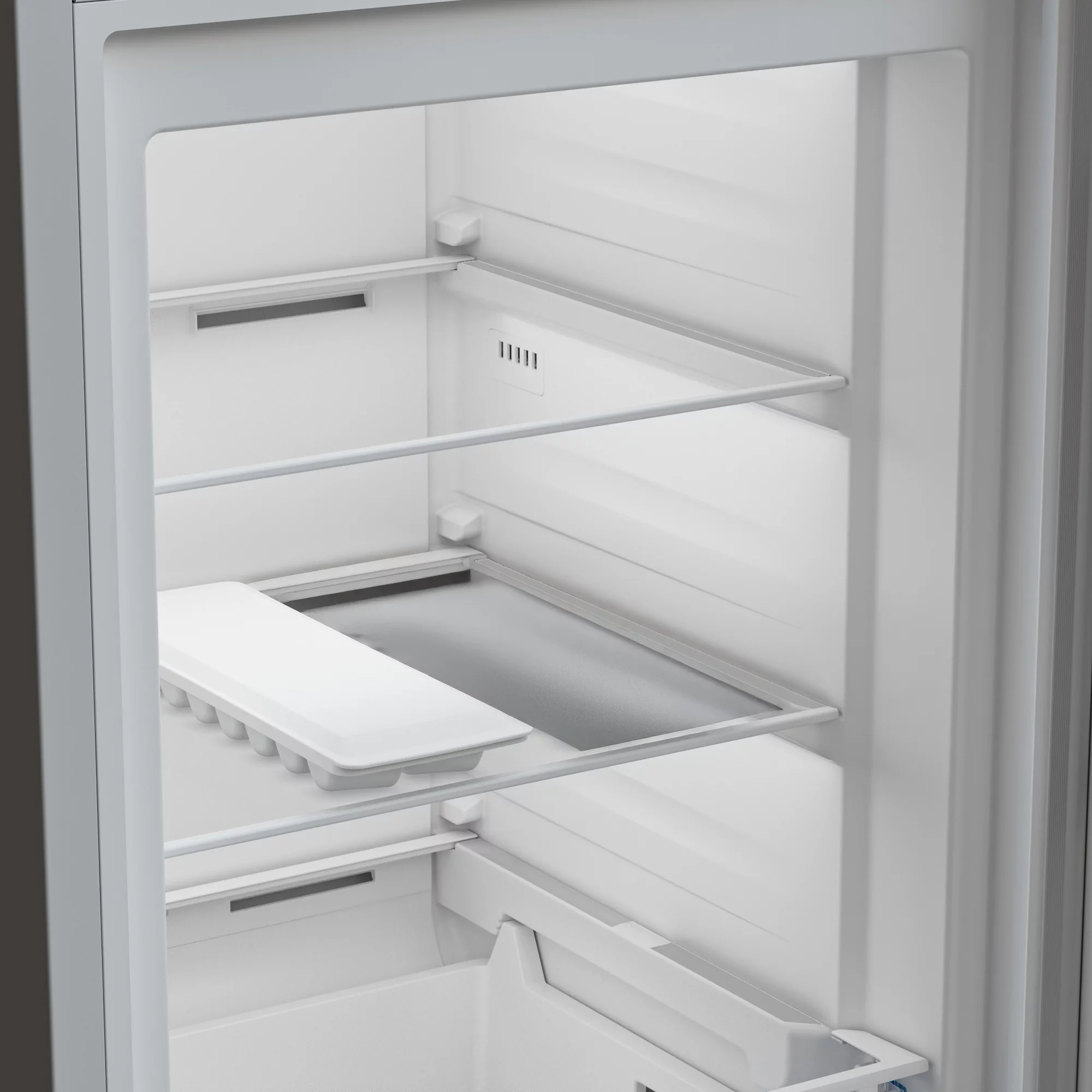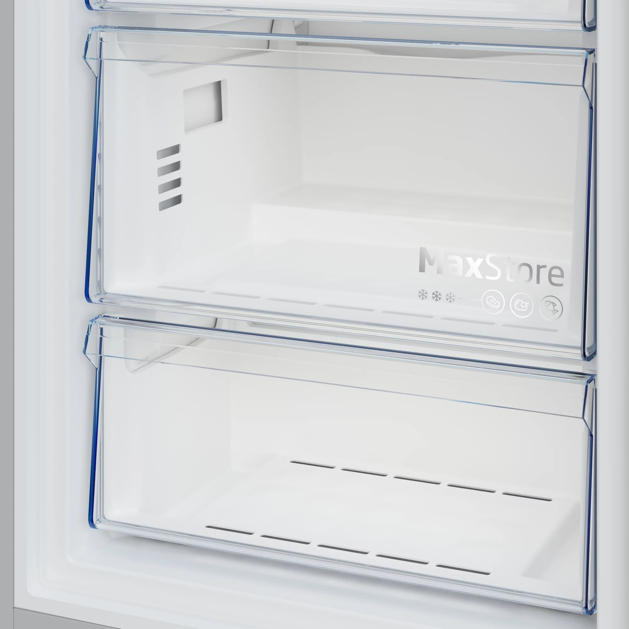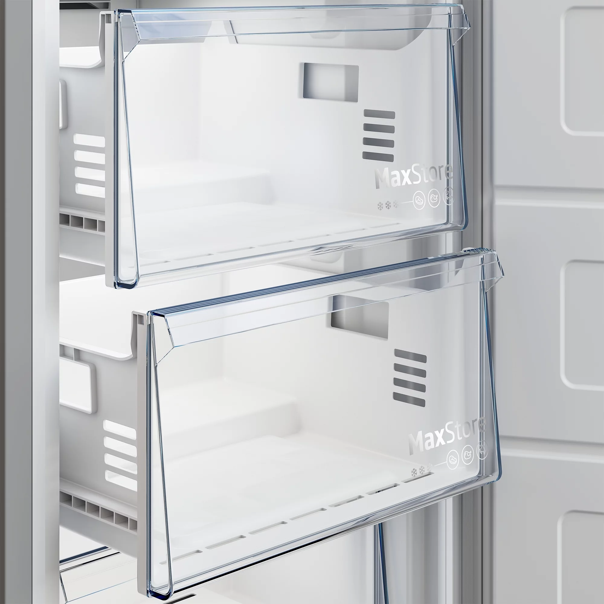 Вертикальна морозильна камера з об’ємом 286 л, класом енергоефективності A+ і системою No Frost — без інею й крижаної кірки. Максимальна продуктивність — до 14 кг продуктів на добу. Вбудований електронний дисплей і сигнал відкритих дверцят спрощують користування. Захист від дітей, можливість перевішення дверей, LED-освітлення й модуль FreezerGuard — гарантія стабільної роботи навіть за температур до –15 °C. За рік споживає близько 332 кВт·год, працює тихо (38 дБ). Висота ~186 см, ширина 60 см, глибина 71 см — підходить для кухонь із обмеженим простором. Надійний вибір для великої сім’ї чи кафе.