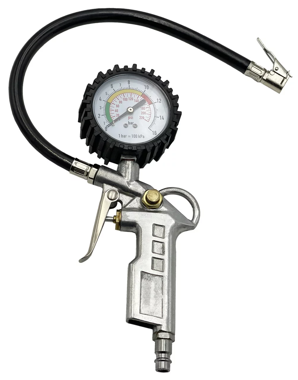 - Пістолет для накачування шин з манометром — дозволяє контролювати та підтримувати потрібний тиск у шинах.
