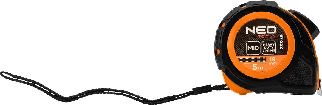 Рулетка сталева 5 м х 19 мм, автоматичний стопор, дві кнопки зупинки 67-222 від NEO TOOLS - це інструмент з робочою довжиною 5 м і шириною 19 мм. Оснащена практичною функцією автоматичної зупинки, яка запобігає самостійному втягуванню рулетки в розгорнутому стані, а також можливістю використання двох кнопок фіксації.