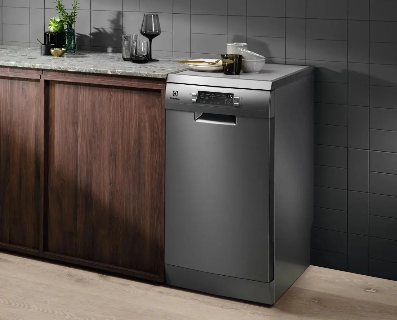 Посудомийна машина Electrolux ESS64321SX з розпилювачем SatelliteClean® забезпечує ретельне миття навіть щільно розставленого посуду. Висувний ящик MaxiFlex вміщує прибори різної форми, а SoftSpike утримує тонке скло. ExtraHygiene додає санітарне полоскання при 69 °C, а AirDry наприкінці циклу відкриває дверцята для природного сушіння. Зручність доповнюють сенсор води та інверторний двигун.