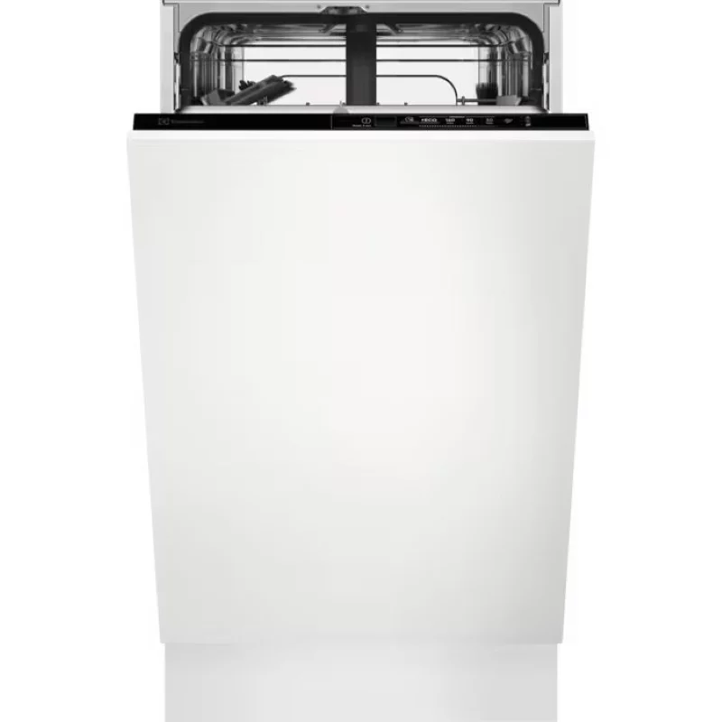 Вбудована посудомийна машина Electrolux EEA71210L з технологією AirDry завершує цикл природним підсушуванням і забезпечує до трьох разів ефективніше сушіння, ніж системи із зачиненими дверцятами. Подвійні розпилювачі подають воду в кожен куточок у верхньому й нижньому кошиках. Є швидка 30-хвилинна програма для невеликих завантажень, а шарніри PerfectFit спрощують монтаж без підрізання плінтуса. Модель оснащена функцією «Полоскання і очікування», автоматичним вимкненням, системою Thermo Efficient та інверторним двигуном.