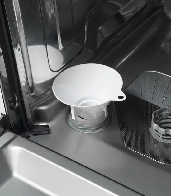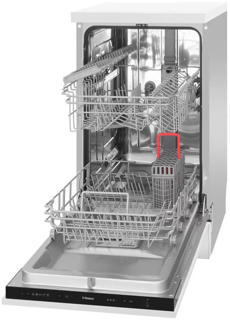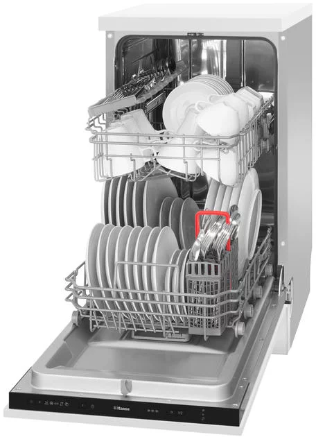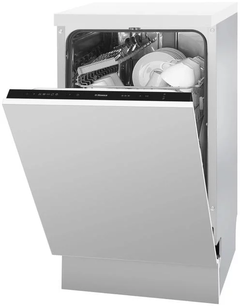 Вбудована посудомийна машина Hansa ZIM435H на 9 комплектів із 5 програмами забезпечує ефективне миття та сушіння класу A. Має функцію половинного завантаження, відкладений старт (3/6/9 год) та додаткове сушіння. Споживає лише 9 л води за цикл, рівень шуму – 49 дБ.