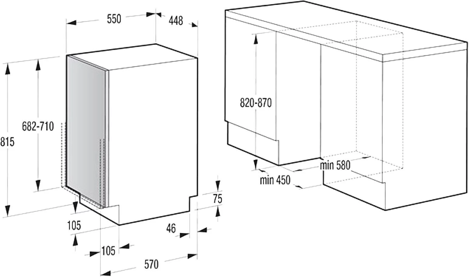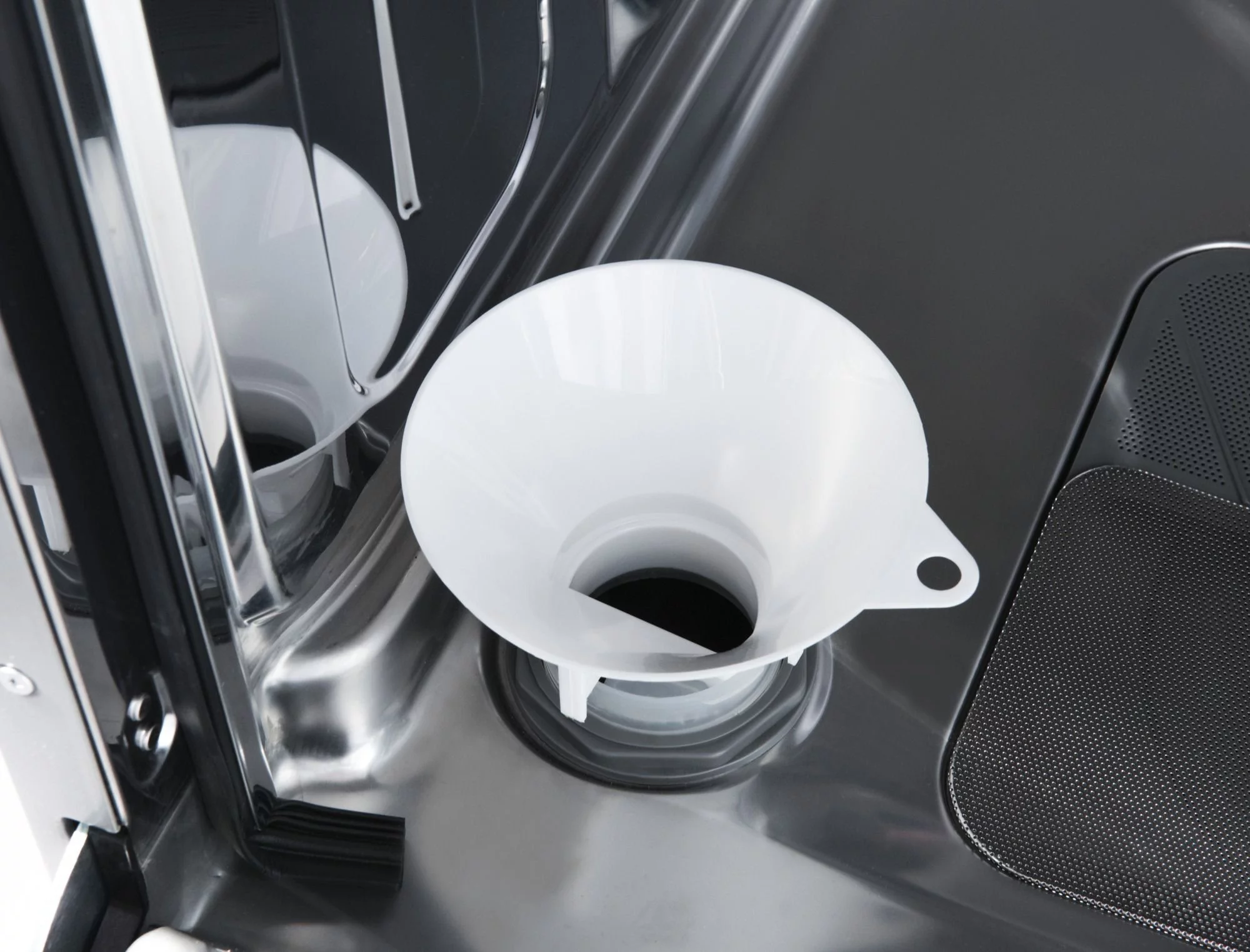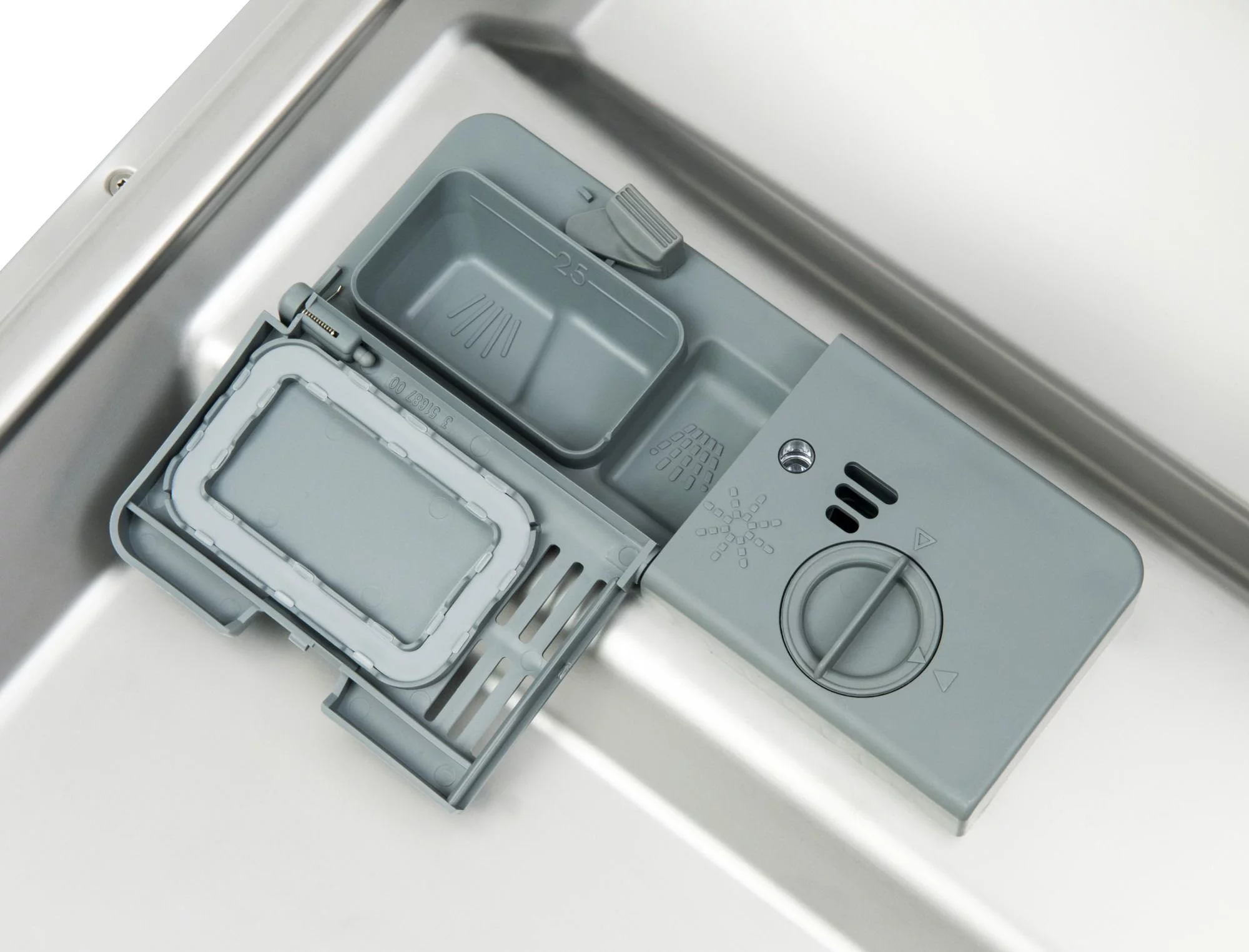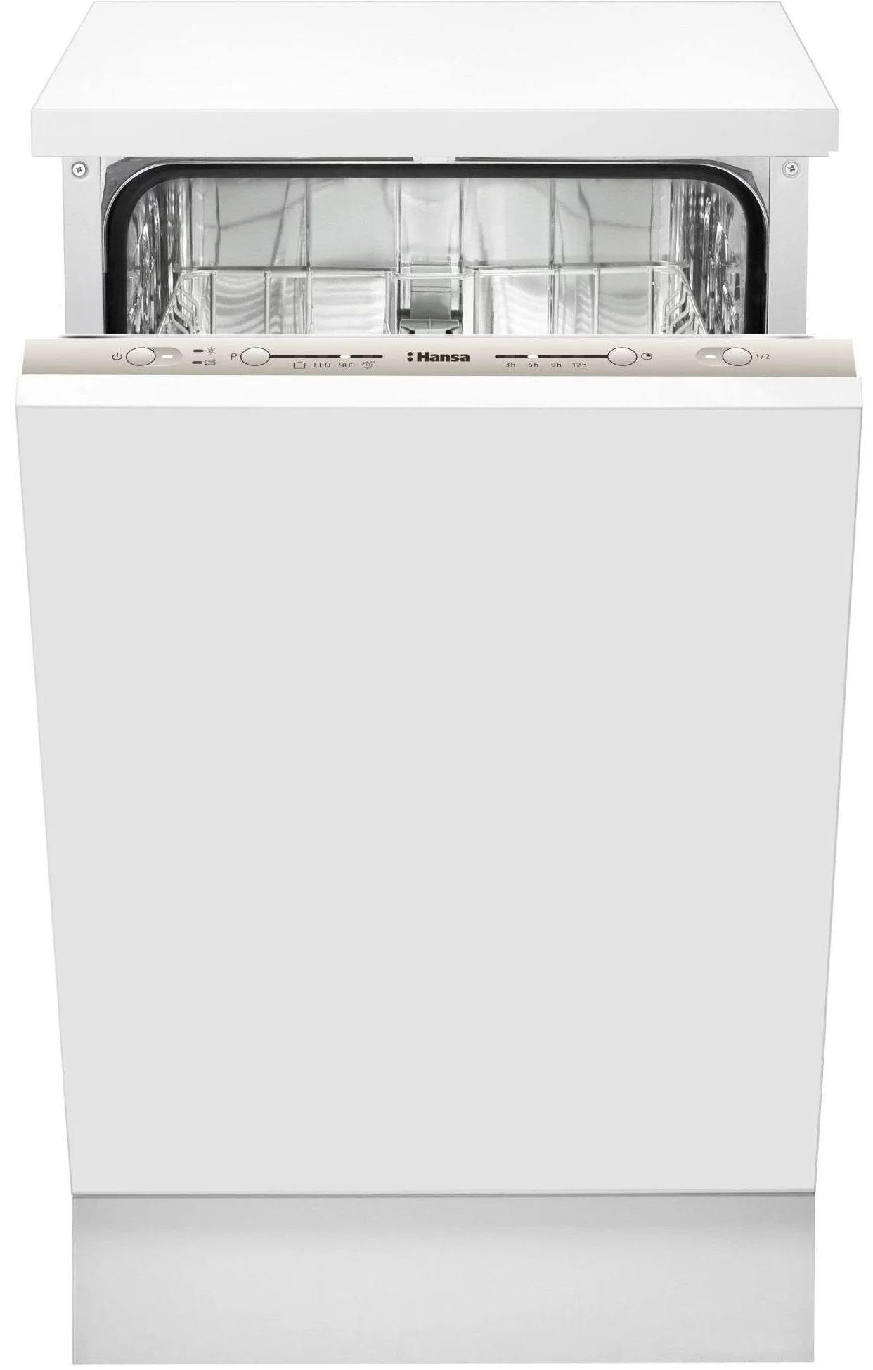 Вбудована посудомийна машина Hansa ZIM434.1B на 9 комплектів із 4 програмами. Має функцію половинного завантаження, відкладений старт (3/6/9/12 год) та індикацію солі й ополіскувача. Споживає лише 9 л води за цикл, рівень шуму — 49 дБ, клас енергоефективності A++.