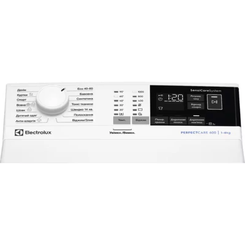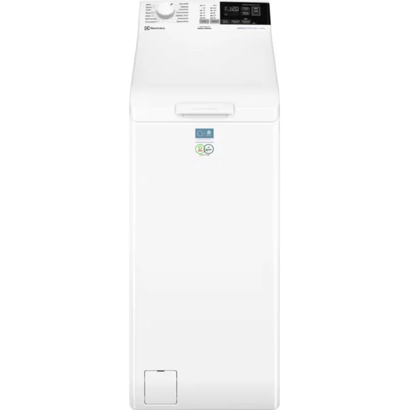 Electrolux EW6T406U — вертикальна пральна машина з SensiCare, що автоматично підлаштовує час, воду та енергію під завантаження. Опції «Додаткове пом’якшення» і «Регулювання часу» забезпечують м’якість і економію, а програма «АнтиАлергія + Пара» видаляє 99,99% бактерій. Soft Opening з автопозиціонуванням барабана та великий LCD-дисплей спрощують завантаження і керування.
