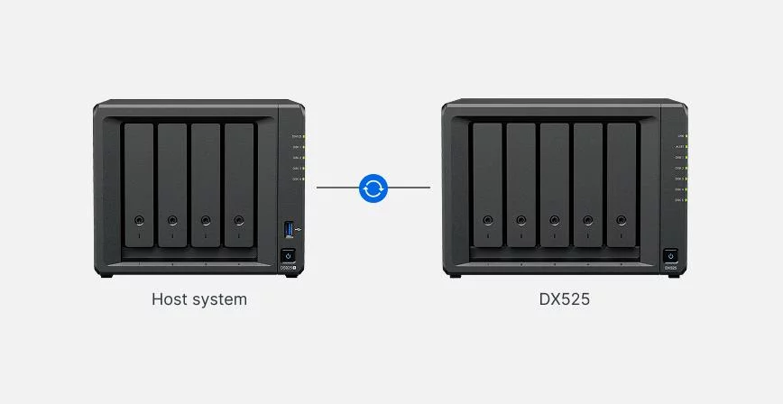 Блок розширення Synology DX525 забезпечує безперервне збільшення ємності NAS-сховища. П’ять відсіків підтримують встановлення HDD або SSD з гарячою заміною. Пристрій працює тихо, енергоефективно та повністю інтегрується з системою Synology DSM. Просте підключення через порт розширення дозволяє миттєво розпізнати нові накопичувачі.