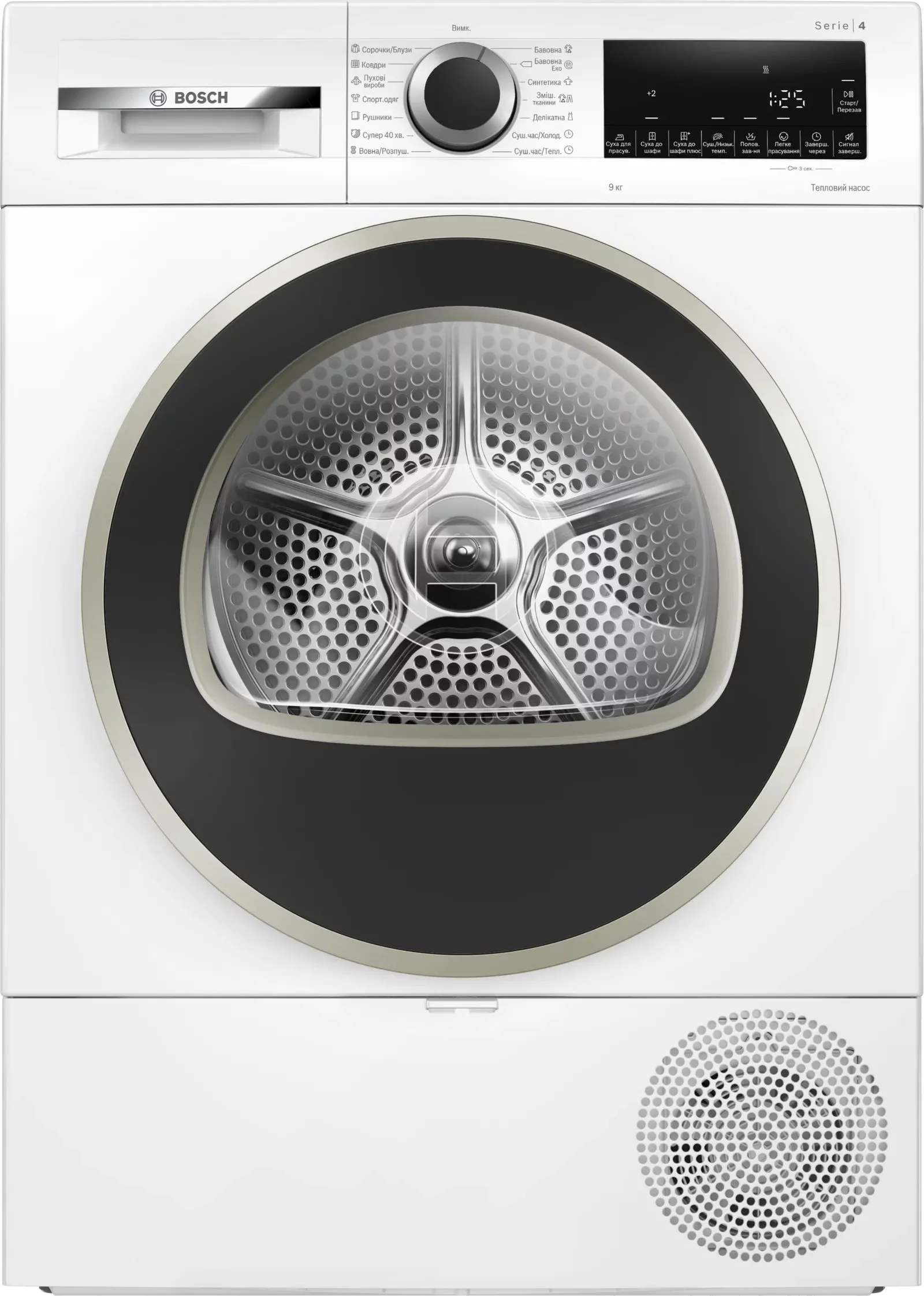 Сушильна машина Bosch WQG14210UA поєднує дбайливе сушіння, енергоощадну роботу з тепловим насосом та автоматичний контроль вологості AutoDry. Модель розрахована на завантаження до 9 кг, тож зручно працює з великими обсягами білизни. Програма Super 40 швидко висушує невелику кількість речей, а індикатор залишкового часу показує, коли цикл завершиться — можна діставати білизну саме в потрібний момент: для прасування або одразу до шафи.