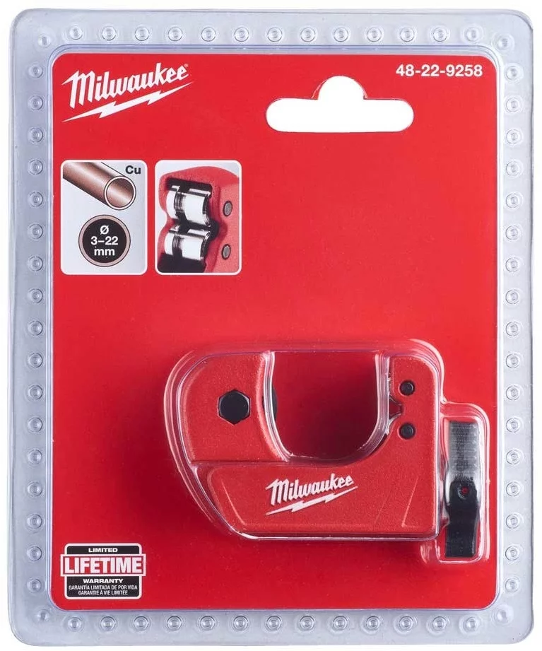 Труборіз Milwaukee 48229258 для мідних труб діаметром 3-22 мм є компактним інструментом з патентованим механізмом регулювання для точного та чистого зрізу без задирок. Виготовлений з хромованої сталі роликів для підвищеної міцності та захисту від корозії. Запасний ролик вбудований у ручку для зручності. Цей виріб пасує до сантехнічних робіт та ремонту.