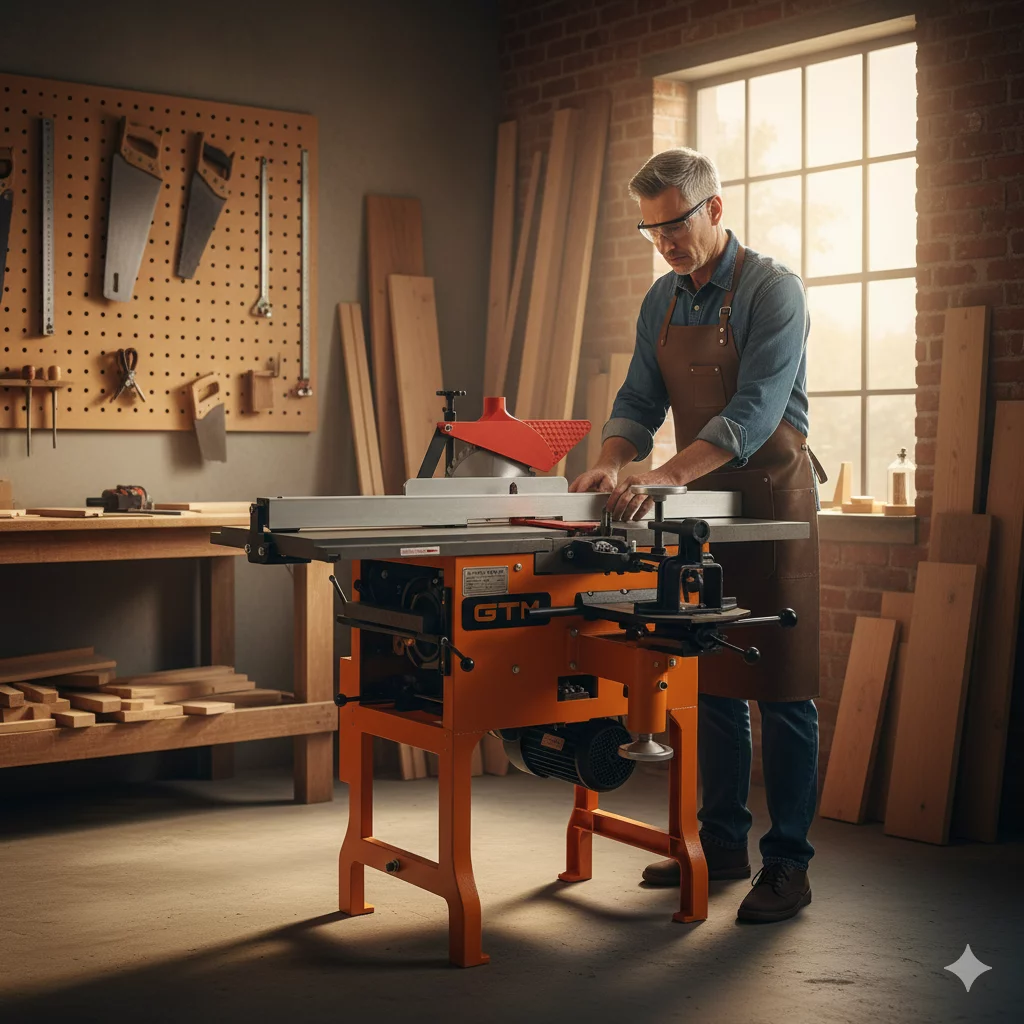 GTM MQ393A - професійне обладнання для обробки деревини. Комбінований верстат MQ393A призначається для фугування, рейсмусування, розпилу дощок, свердління дерев'яних заготовок, вирізання пазів і інших робіт по дереву. У верстаті є можливість гнучкого налаштування конструкції під конкретну задачу, що значно спрощує роботу користувача і виключає необхідність покупки декількох окремих верстатів. Робочі частини наводяться в рух однофазним асинхронним двигуном потужністю 2200 Вт. Завдяки мідній обмотці двигун відрізняється надійністю і витримує значні навантаження.