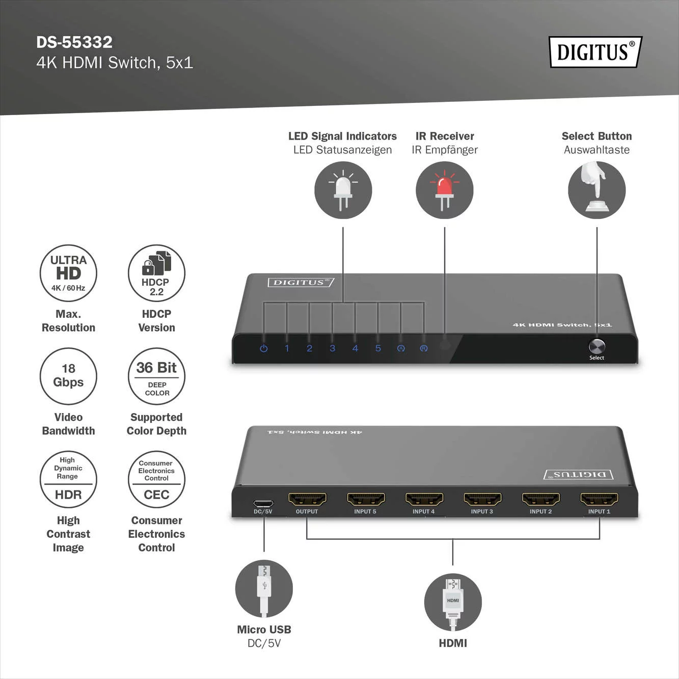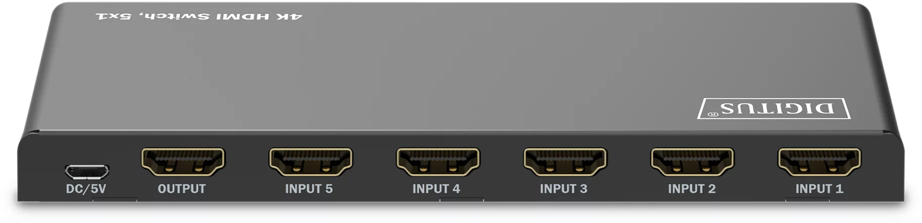 Відеокомутатор DIGITUS UHD HDMI 5x1 дозволяє підключити п’ять джерел сигналу до одного дисплея через HDMI. Перемикання між пристроями відбувається за допомогою дистанційного керування, на самому пристрої або автоматично. Підтримує роздільну здатність 4K/60 Гц, HDR та HDCP 2.2 для високої якості відео. Живлення здійснюється через Micro USB, що робить установку простою та зручною. Ідеальний для домашніх кінотеатрів, конференц-залів і настінного монтажу телевізора.