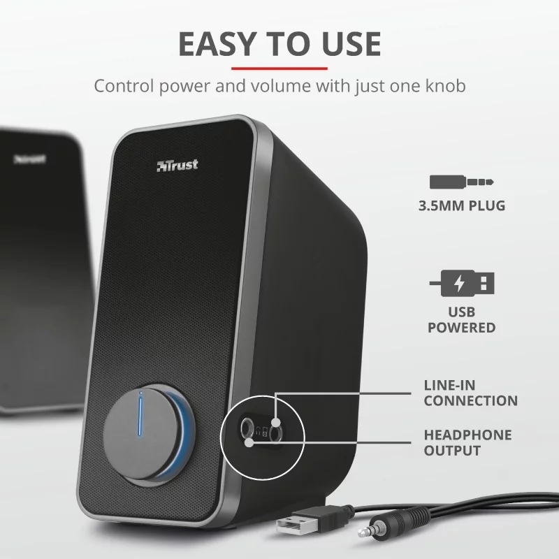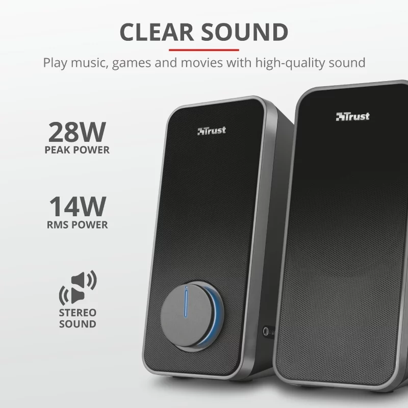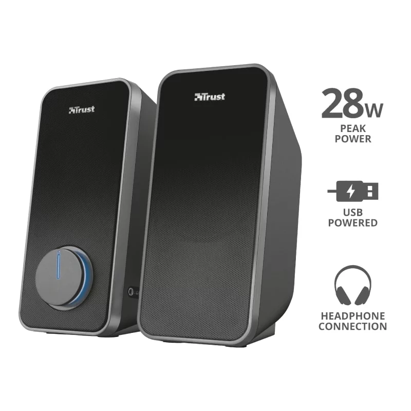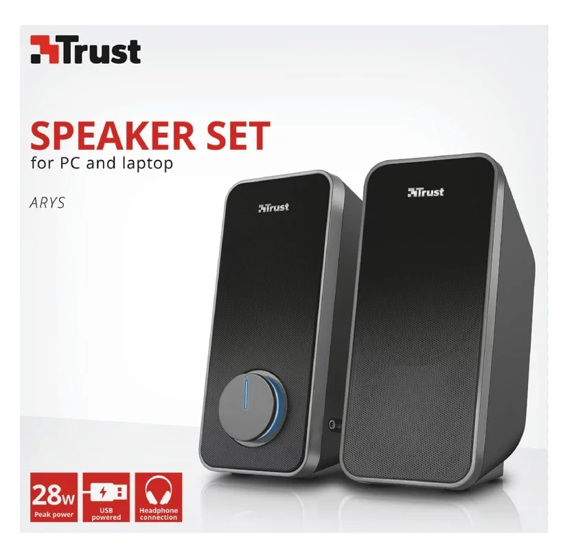 Arys 2.0 Speaker Set - набір динаміків, який забезпечує насичений звук і глибокий бас для вашого ПК або ноутбука завдяки пікової потужності в 28 Вт. Універсальне використання: можна підключити телефон, планшет або інший пристрій для відтворення музики. Розетка не потрібна: просто підключіть USB і кабель aux до свого ноутбука. Металеві грати на передній частині обох колонок додають нотку міцності - як в зовнішньому вигляді, так і довговічності.