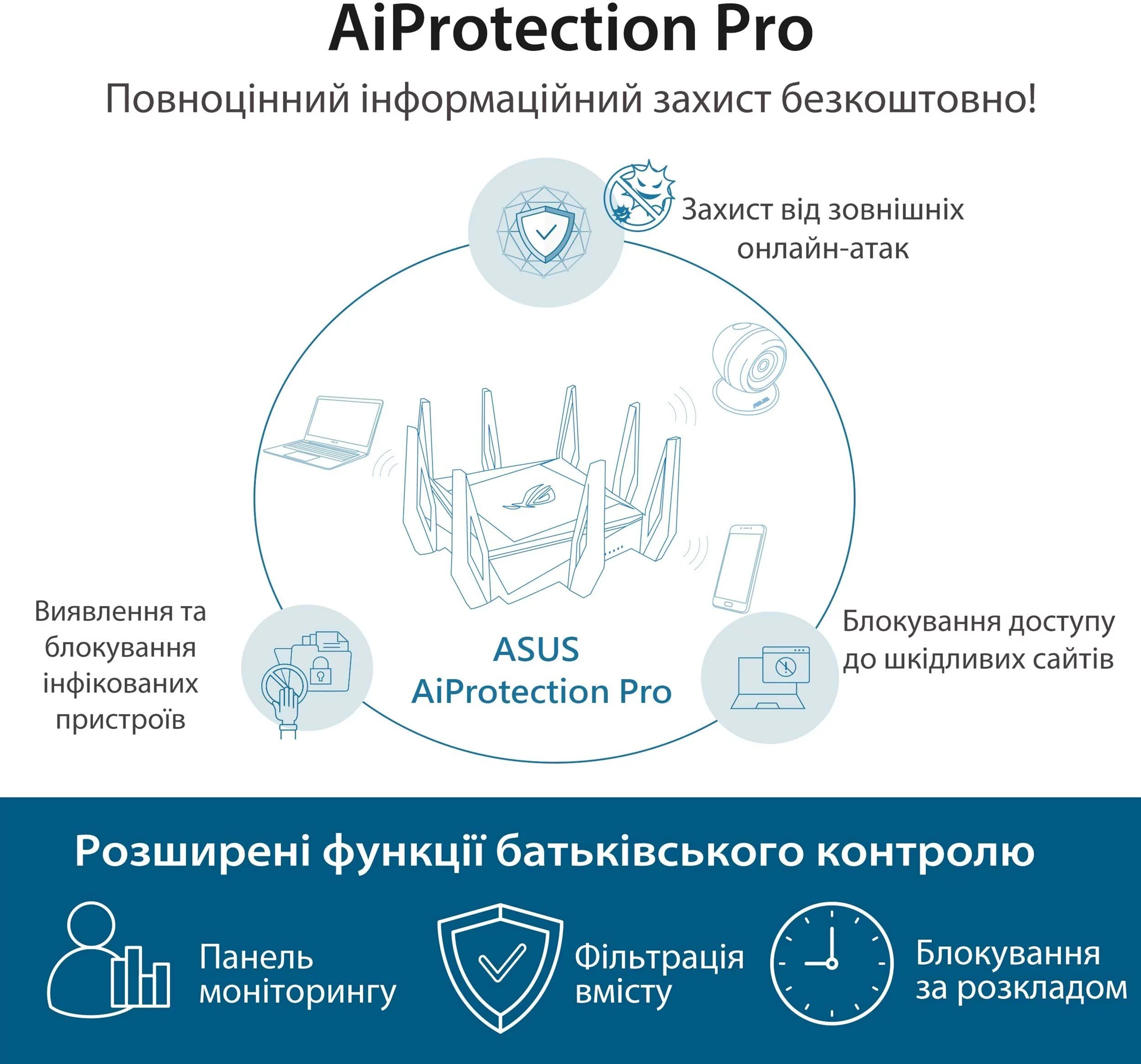 Adaptive QoS, AiProtection Pro, Link Aggregation 802.3ad, MU-MIMO, QoS, Roaming Assist, Smart Connect, Traffic Analyzer, WTFast Gamers Private Network, Вбудовані мережеві утиліти: ping, traceroute, nslookup, netstat, Wake-on-LAN, Гостьова мережа, Діагностика: вбудовані мережеві утиліти, Діагностика: графічна карта мережі, Додаткові можливості Wi-Fi: вкл / викл. радіомодулів, IGMP Snooping, бездротовий планувальник, Додаткові можливості доступу: перемикач портів, переадресація (форвардного) портів, DMZ, DDNS, проходження через NAT з`єднань PPTP, L2TP, IPSec, RTSP, H.323, SIP та ретрансляція PPPoE, Додаткові сервіси: персональний хмарний сервіс AiCloud, FTP і Samba файловий сервер, принт-сервер, підтримка USB 3G-модемів, вбудований Download Master, медіа-сервер, Кілька режимів роботи: бездротовий маршрутизатор, точка доступу, медіа-міст, AiMesh, Підтримка IPTV, підтримка VPN-тунелів, Підтримка технології Beamforming, Підтримка хмарної платформи AiCloud, резервне копіювання для MacOS, Управління смугою пропускання, 20/40/80/160 MHz bandwidth, 1024-QAM high data rate