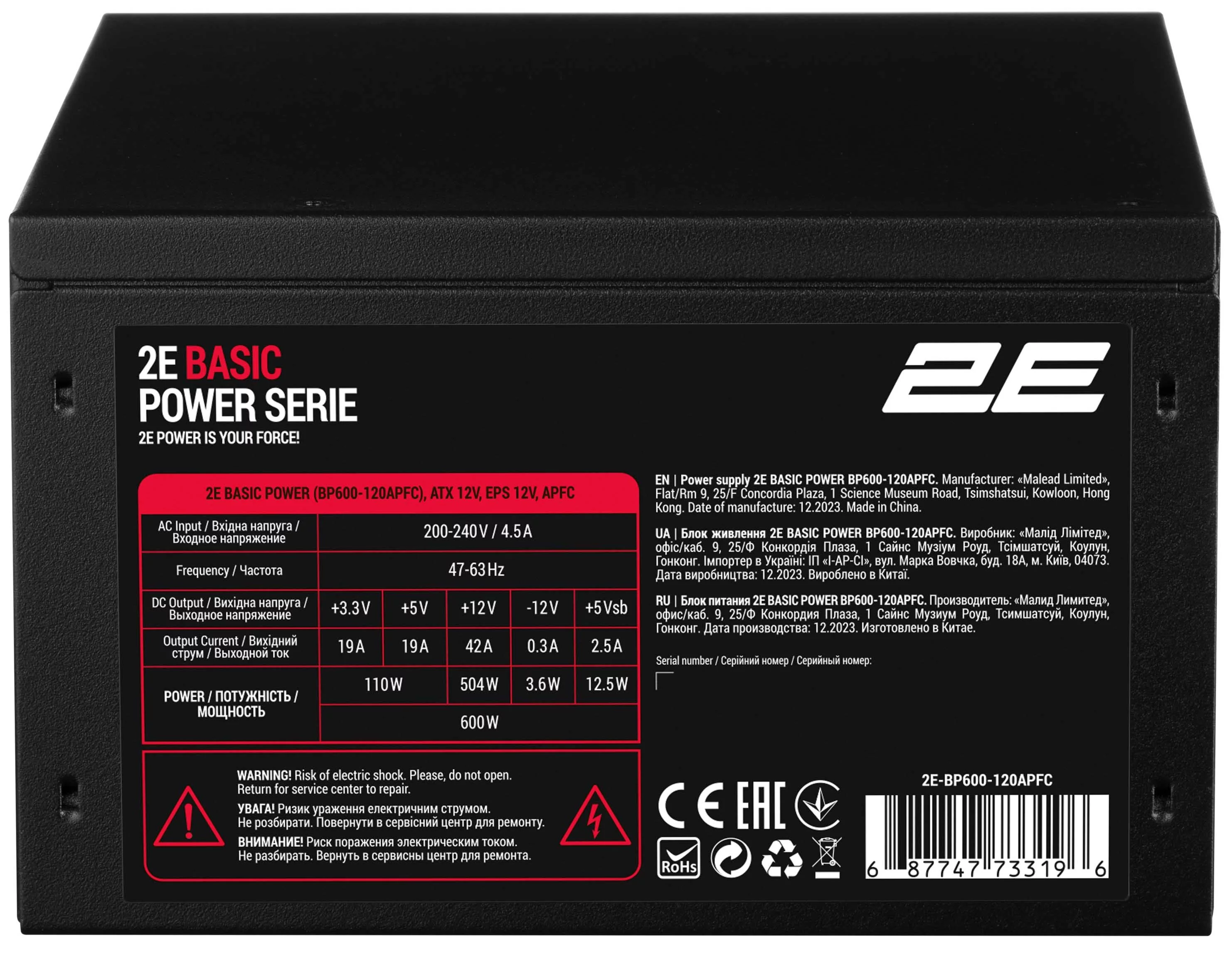 Блок живлення 2E BASIC POWER (600 W) з кабелем живлення для сучасних персональних комп'ютерних систем бюджетного та середнього рівня, офісних ПК для вирішення різноманітних завдань.