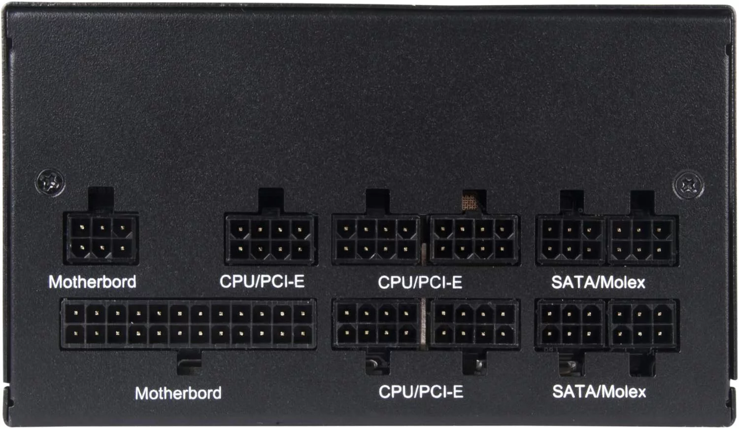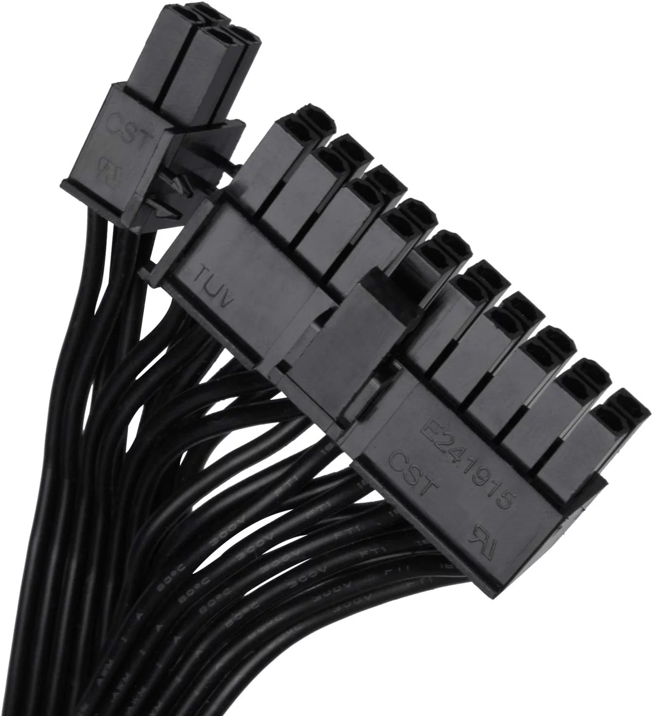 1 x 24 / 20-Pin (600мм), 2 x 8 / 4-Pin EPS / ATX 12V (750мм x 2), 4 x 8 / 6-Pin PCIe (650мм x 2 / 650+150мм x 1), 6 x 4-Pin Peripheral (600мм / 150мм / 150мм / 150мм x 2) + 1 x 4-Pin Floppy adapter , 8 x SATA (600мм / 150мм / 150мм / 150мм x 2)