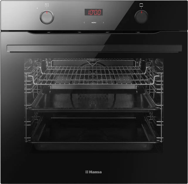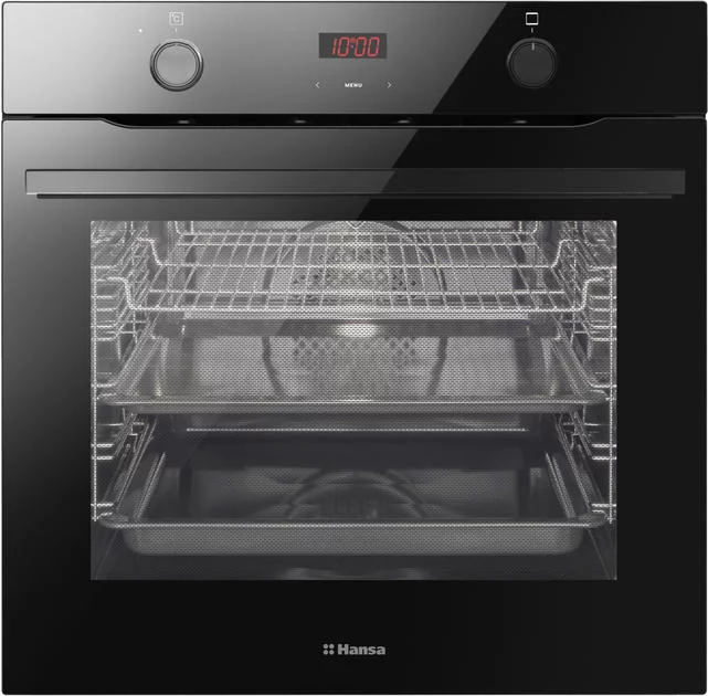 Hansa BOES684620 – електрична духова шафа з об'ємом 77 літрів, чорним дизайном та паровою системою очищення. Оснащена 9 режимами приготування, потужністю швидкого розігріву 3500 Вт і сенсорним керуванням із зручними натискно-тягнучими ручками. LED-дисплей, стандартні бокові напрямні, 3-скляні дверцята та клас енергоспоживання A забезпечують функціональність, безпеку й ефективність у повсякденному користуванні.
