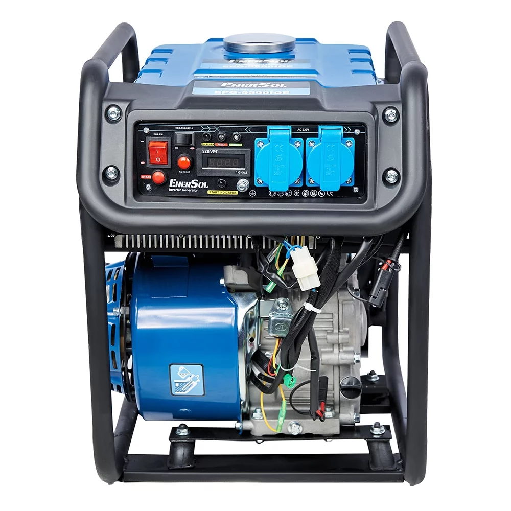 EnerSol EPG-5500IOE формує стабільне однофазне електропостачання потужністю 5 кВт номінально та 5,5 кВт максимум при напрузі 230 В. Інверторний механізм генерує чисту синусоїдальну хвилю для безпечного живлення чутливих пристроїв. Двигун GP236 об'ємом 236 см³ з електростартером обертається на 3000 об/хв, бак вміщує 7 л бензину з витратою 0,35 л/кВт·год. Дві розетки по 16 А з заглушками, дисплей показує напругу та мотогодини, шум на рівні 63 дБ на 7 м. Габарити 440x380x460 мм та маса 28 кг полегшують транспортування.