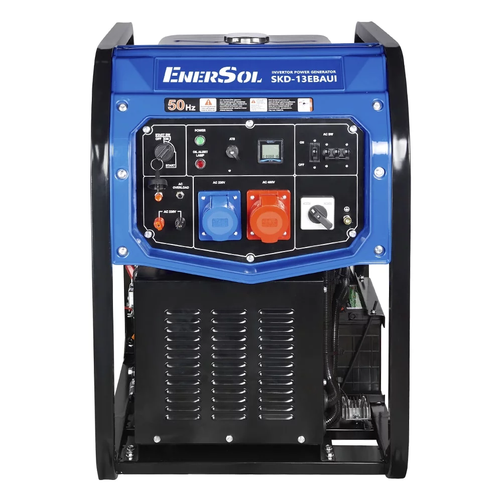Інверторний дизельний генератор EnerSol SKD-13EBAUI створений для стабільного живлення у побуті й на об’єктах з підвищеним навантаженням. Двигун потужністю до 13 кВт та електростартер забезпечують легкий запуск і сталу роботу. Модель підтримує напругу 230 В або 400 В, що робить її універсальною для різних систем. Завдяки коліщатам і компактному формату пересування генератора не потребує зусиль.