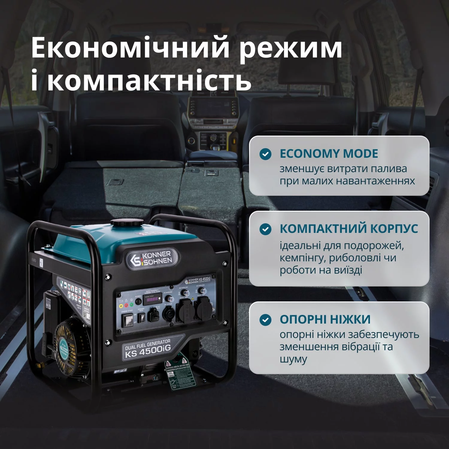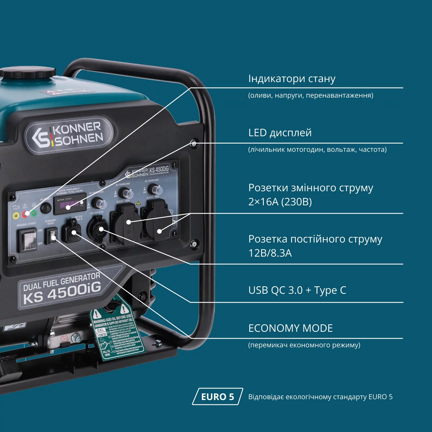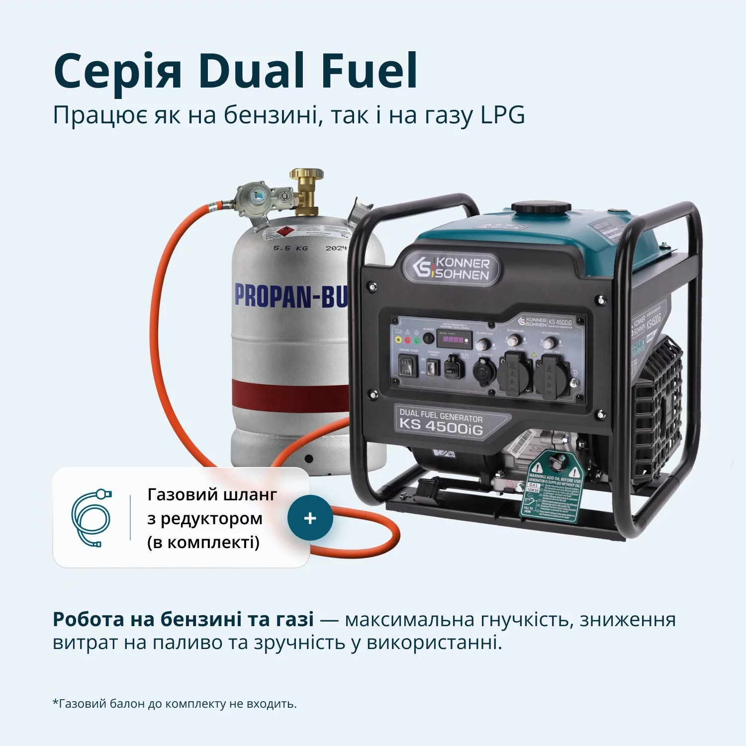 Двопаливний інверторний генератор KS 4500iG (4,2 кВт на бензині, 3,8 кВт на газі) забезпечує стабільне електроживлення для медичного обладнання, лабораторних приладів, серверів, систем збереження даних та ін. Інверторна технологія гарантує чисту синусоїду — безпечно для чутливої електроніки. Працює на бензині й газі (LPG), знижуючи витрати й викиди. У комплекті — шланг 1,5 м та редуктор. Оснащений надійним двигуном K&S (EURO V), LED-дисплеєм, розетками 16А, 12В, USB QC 3.0, Type-C. Має економний режим, компактний та зручний у транспортуванні.