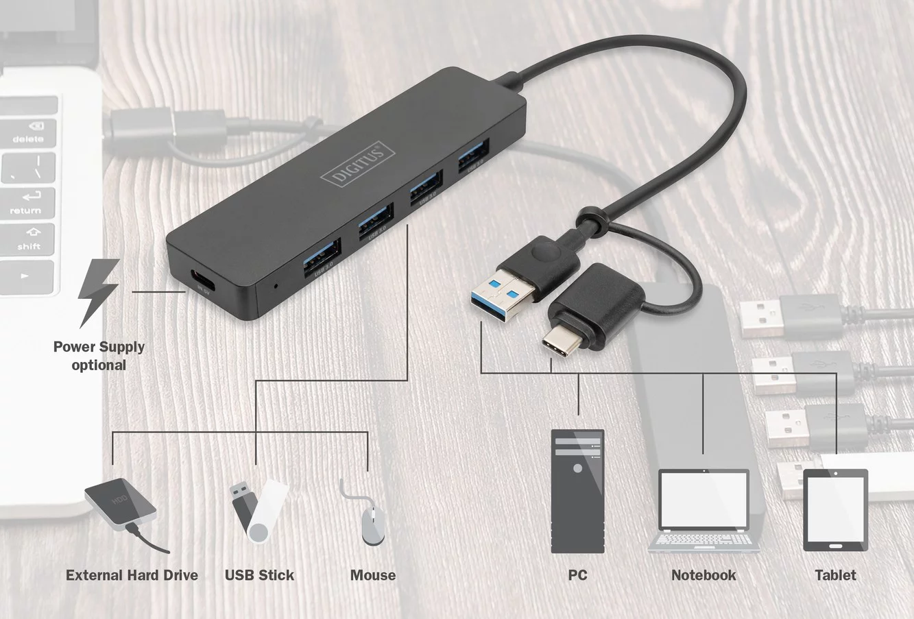 Компактний 4-портовий USB 3.0 концентратор DIGITUS Slim Line з кабелем 0,2 м забезпечує швидку передачу даних до 5 Гбіт/с. Підтримує підключення кількох пристроїв одночасно, має зворотну сумісність із USB 2.0 та 1.1. Підходить для використання вдома, в офісі та у подорожах.