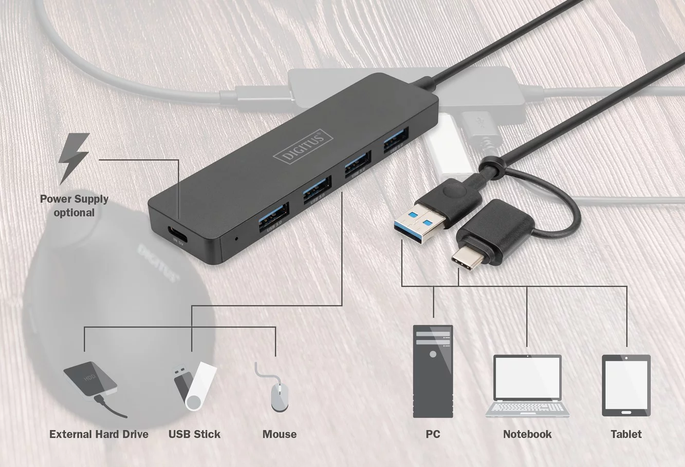 Компактний 4-портовий USB 3.0 концентратор DIGITUS Slim Line з кабелем 1,2 м забезпечує швидку передачу даних до 5 Гбіт/с. Підтримує підключення кількох пристроїв одночасно, сумісний із USB 2.0 та 1.1. Підходить для використання вдома, в офісі та у подорожах.