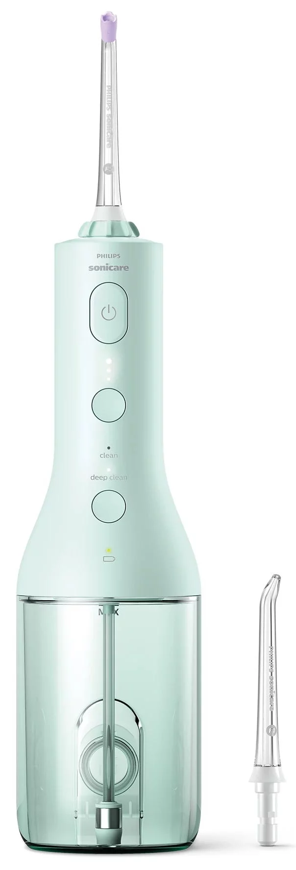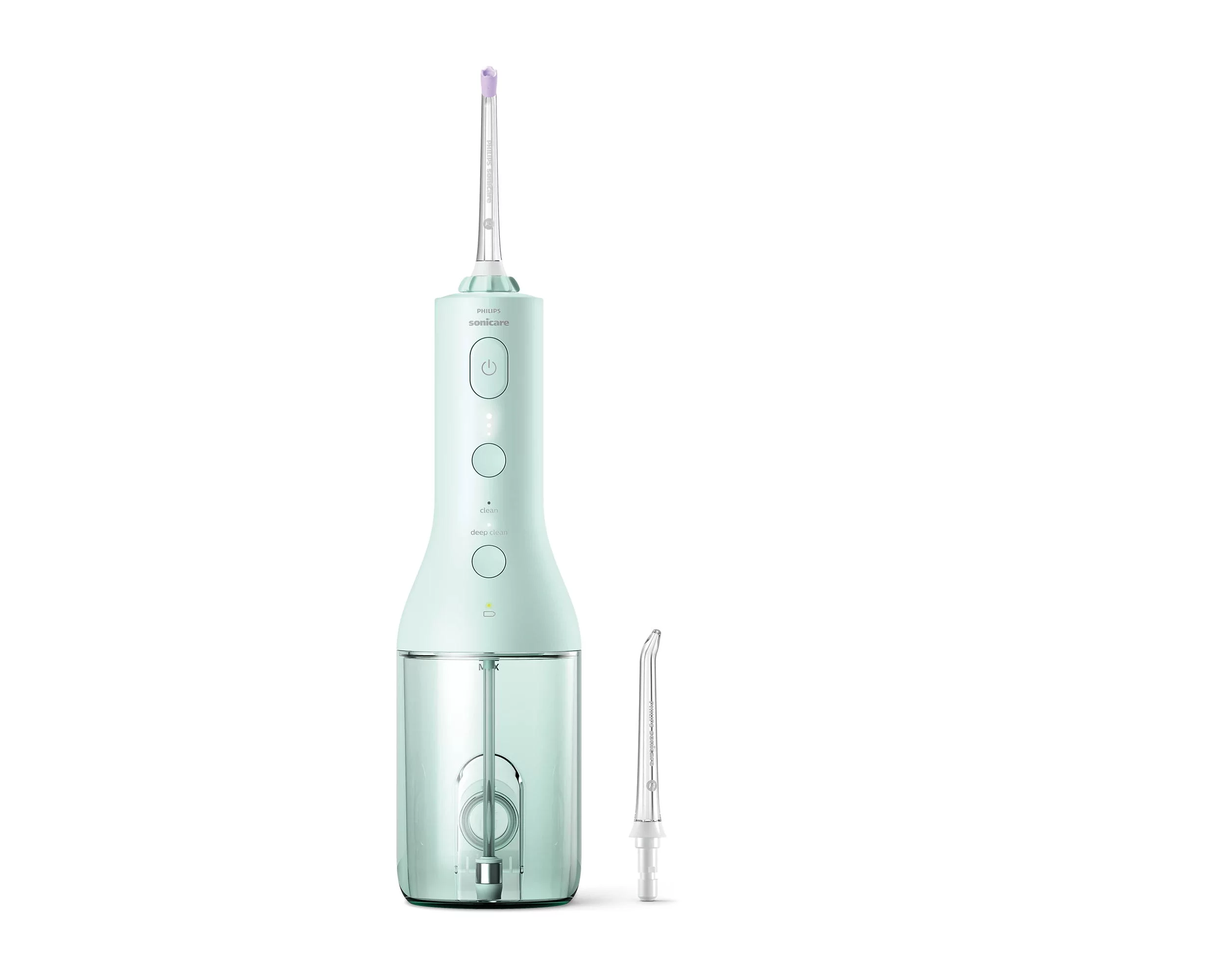 Портативний іригатор Philips Sonicare Cordless Power Flosser 3000 забезпечує ефективне очищення міжзубних проміжків завдяки потужним пульсуючим струменям води. Оснащений двома режимами роботи та двома насадками, він підходить для щоденного догляду вдома чи у подорожі. Пристрій працює до двох тижнів без підзарядки й комплектується зручним чохлом для транспортування.
