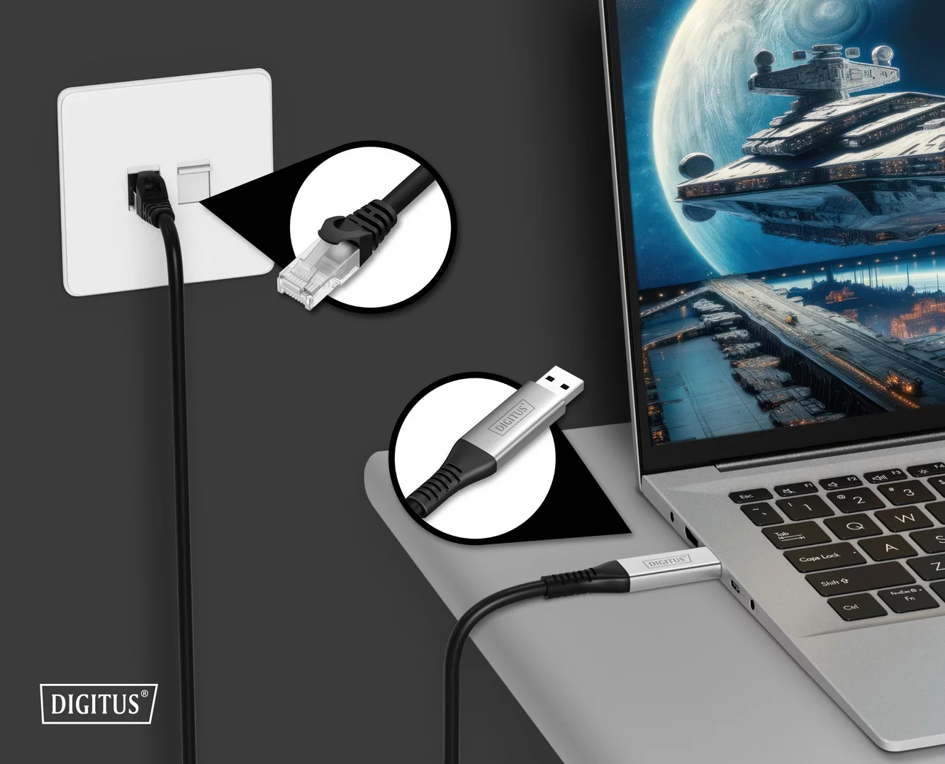 Кабель Digitus USB-A – RJ45 Ethernet дозволяє легко підключити пристрої з портом USB-A до дротової мережі, забезпечуючи стабільне гігабітне з’єднання без потреби в адаптерах. Ідеально підходить для ноутбуків, ПК та інших пристроїв без Ethernet-порту. Підтримка Wake-On-LAN і Wake-On-WAN дає змогу дистанційно активувати пристрій. Безпечний LSZH-корпус мінімізує дим та токсичні випари у разі пожежі. Plug-and-play, сумісний з macOS і Windows — без драйверів і зовнішнього живлення. Довжина кабелю — 2 м. Категорія: CAT 6A S/FTP.