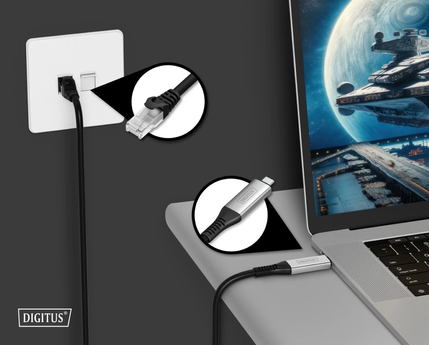 Кабель Digitus USB-C 3.2 Gen1 – RJ45 Ethernet дозволяє легко підключити пристрої з USB-C до дротової мережі, забезпечуючи стабільне гігабітне з’єднання без потреби в адаптерах. Ідеально підходить для ноутбуків, планшетів і смартфонів без Ethernet-порту. Підтримка Wake-On-LAN та Wake-On-WAN дає змогу дистанційно активувати пристрій. Безпечний корпус LSZH мінімізує дим та токсичність у разі пожежі. Plug-and-play, сумісний з macOS і Windows — без драйверів і зовнішнього живлення.