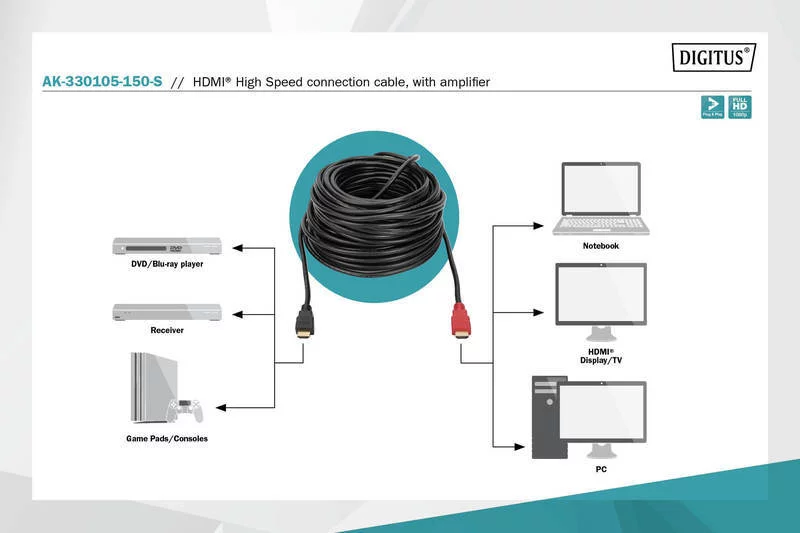 Цей відповідний для Full HD (1080p) та 3D кабель з активним підсилювачем використовується для підключення аудіо / відео пристроїв, таких як Blu-ray-програвач, ігрові планшети або приставки та т. д., наприклад, до телевізора, монітора або комп'ютера.