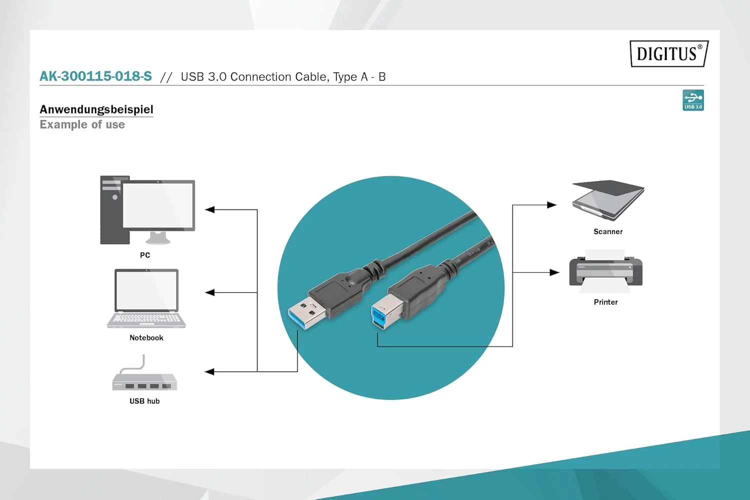 Кабель DIGITUS USB 3.0 (AM/BM) довжиною 1.8 м – це надійне рішення для швидкої та стабільної передачі даних. Завдяки підтримці стандарту USB 3.0 кабель забезпечує швидкість передачі до 5 Гбіт/с, що удесятеро перевищує можливості USB 2.0. Конектори типу AM (папа) та BM (папа) дозволяють підключати периферійні пристрої, такі як принтери, сканери або зовнішні накопичувачі, до ПК чи ноутбука.