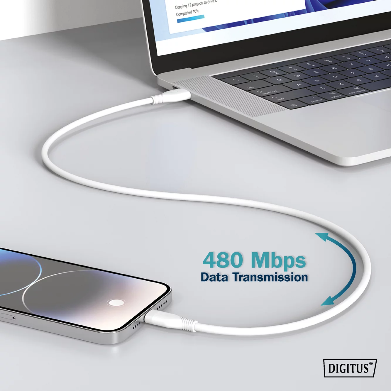 DIGITUS AK-300340-010-W — це силіконовий кабель USB-A > USB-C довжиною 1 метр, створений для швидкого заряджання та синхронізації пристроїв. Він підтримує стандарт USB 2.0 зі швидкістю передачі даних до 480 Мбіт/с, що підходить для повсякденних задач, таких як обмін файлами чи підключення мобільних пристроїв. Завдяки підтримці Power Delivery, кабель забезпечує заряджання потужністю до 60 Вт (20 В, 3 А), що дозволяє швидко заряджати смартфони, планшети та інші сумісні гаджети.