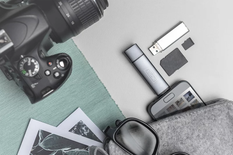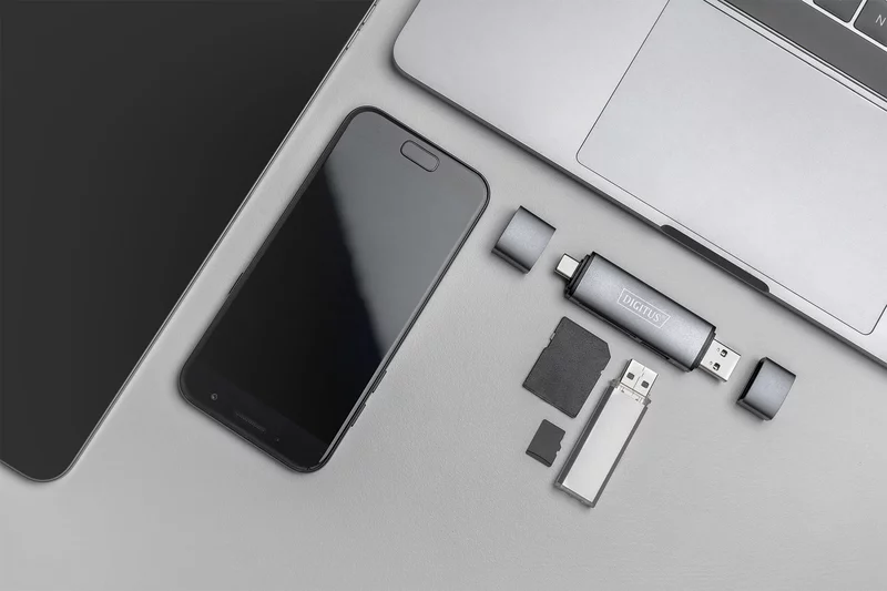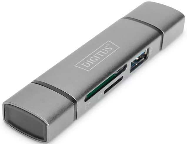 Просте підключення карт пам’яті та USB-накопичувача до смартфона або планшета – USB-C і USB A. Подвійний кардрідер DIGITUS® з вбудованим USB-концентратором (OTG) можна підключити до смартфона, планшета або ноутбука. Це дозволяє отримати доступ до вставлених носіїв інформації, таких як флешки, карти пам'яті SD або MicroSD.