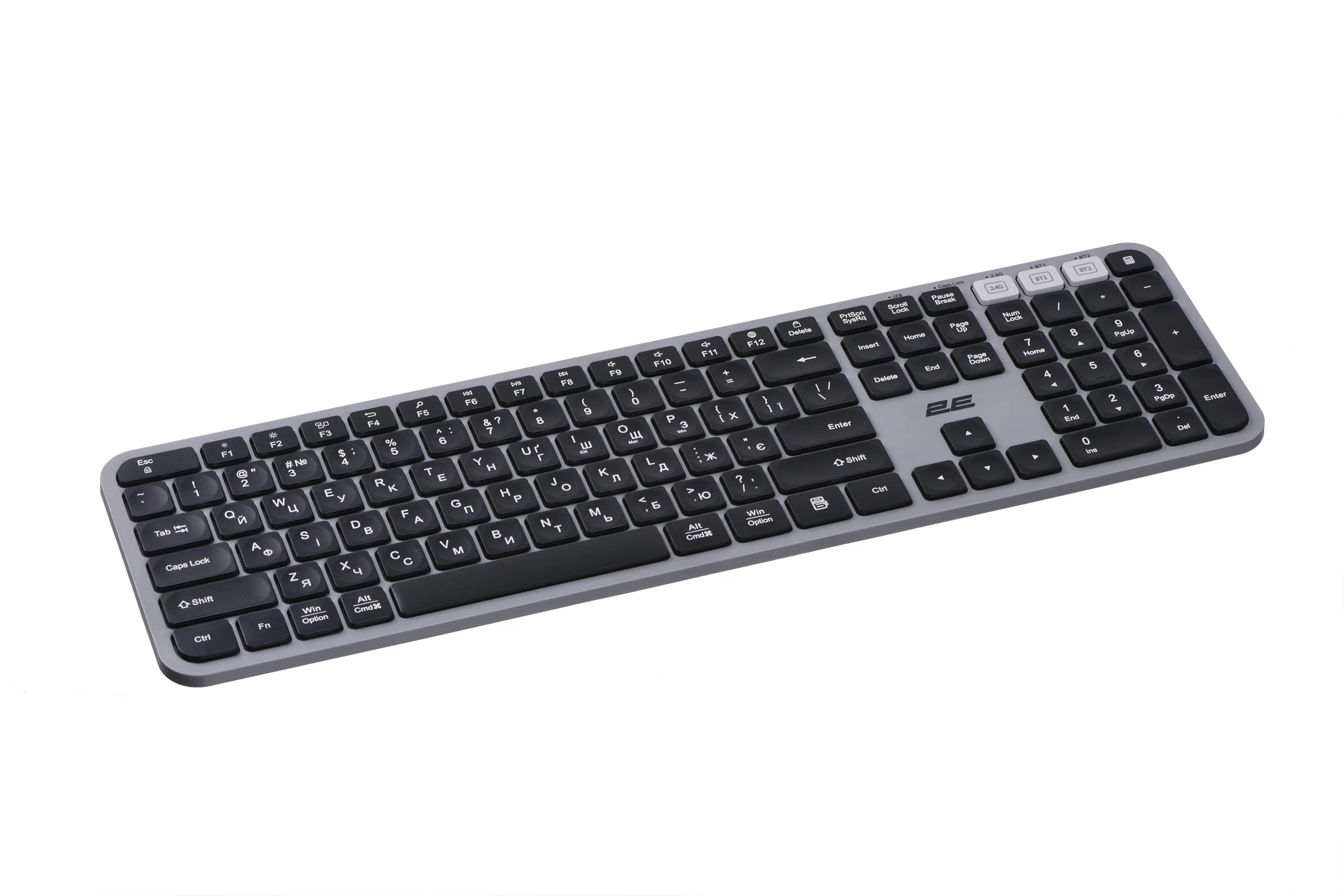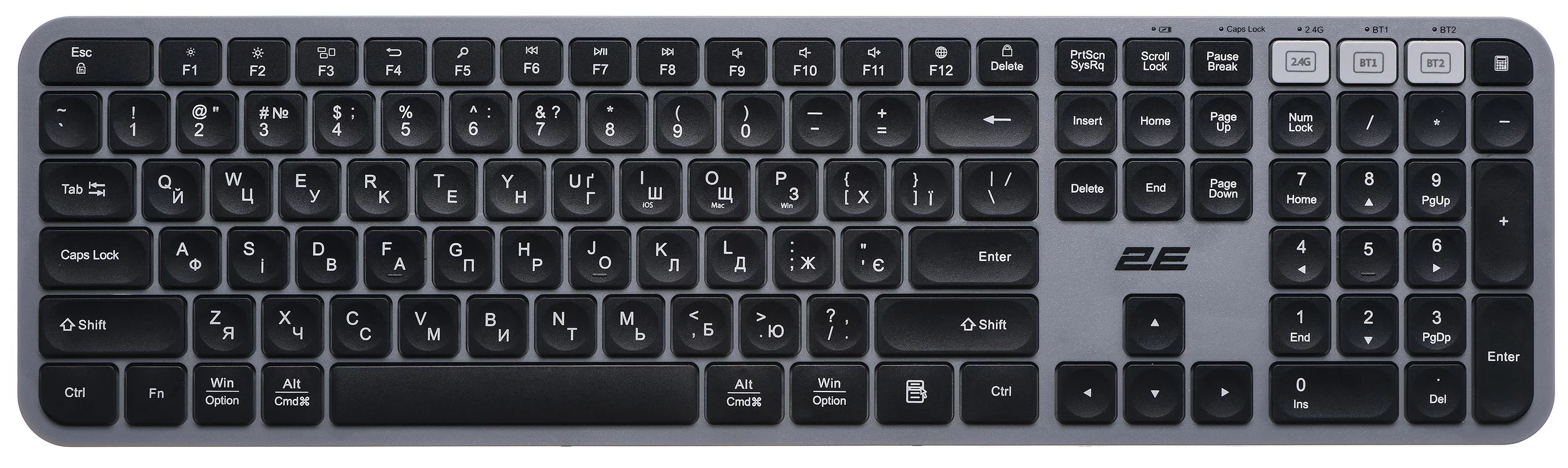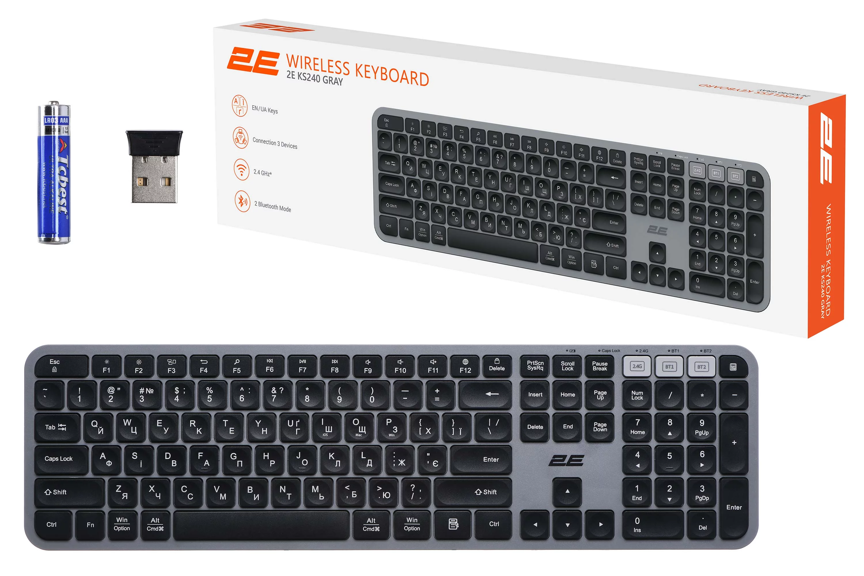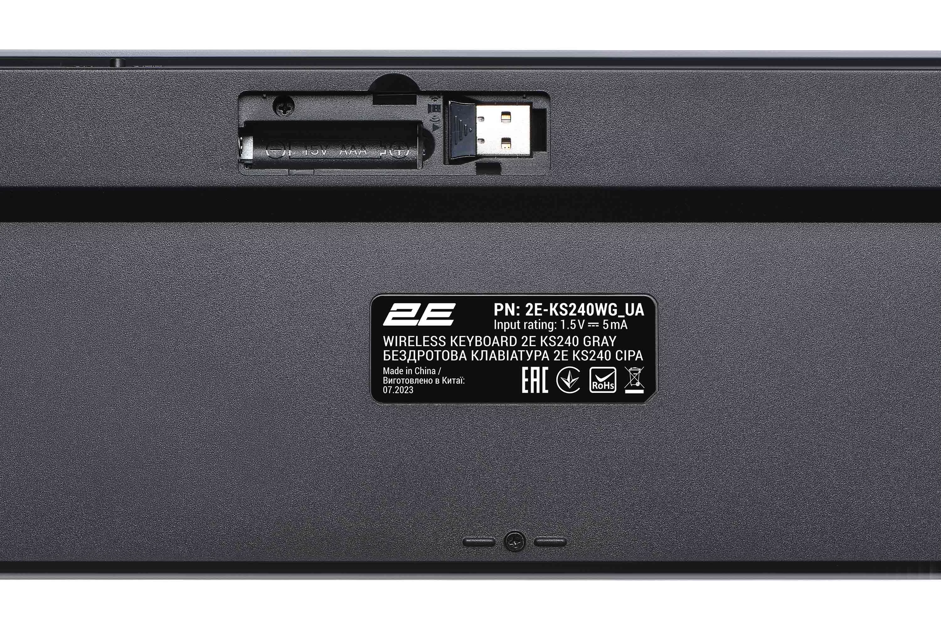Виконана в мінімалістському стилі, ергономічна повнорозмірна бездротова клавіатура 2E KS240 WL BT є справжнім витвором мистецтва створення сучасної комп’ютерної периферії. Тризонна клавіатура має увігнуті клавіші, що забезпечують зручність і комфорт під час тривалого друку. 110 клавіш, з-поміж яких 12 мультимедійних, вирізняються низьким ходом. Аксесуар виготовлено з легкого й водночас стійкого до пошкоджень ABS-пластику, вага моделі становить 513 г.