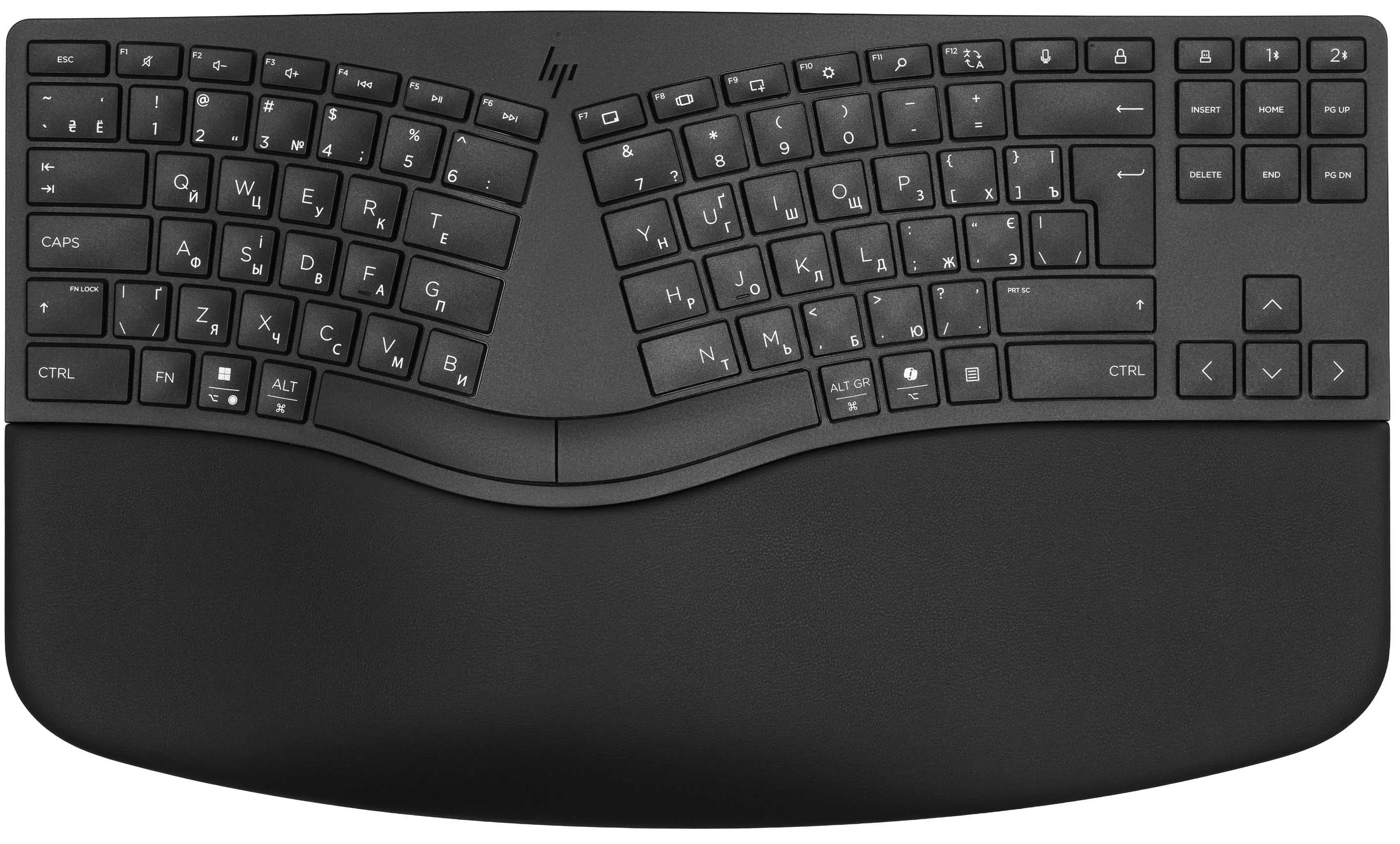 HP 960 Ergonomic (7E755AA) — це бездротова ергономічна клавіатура з розділеним дизайном і м’якою опорою для зап’ясть, що зменшує м’язове навантаження під час тривалого друку. Оснащена 20 програмованими клавішами, знімним цифровим блоком і підтримкою одночасного підключення до трьох пристроїв через Bluetooth® або HP Unifying Dongle. Підтримує очищення дезінфікуючими серветками, має термін служби батареї до 24 місяців та сертифікати Human Factors і U.S. Ergonomics.