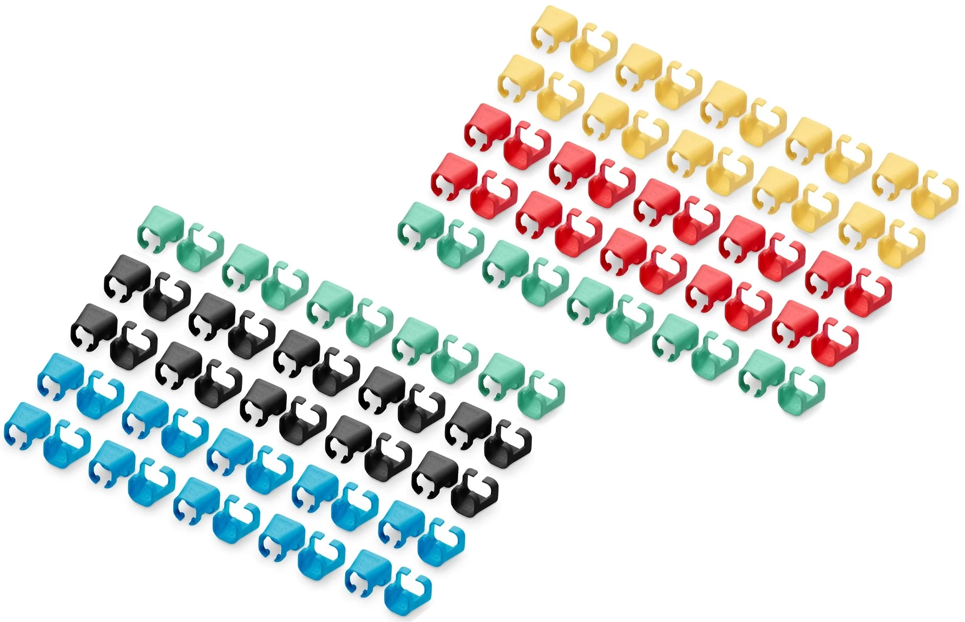 Кольорові кліпси/чохли DIGITUS для патч-кабелів допомагають швидко маркувати та впорядковувати лінії у мережевих шафах і робочих зонах. У комплекті 5 кольорів по 20 шт. Сумісні з патч-кабелями CAT5e–CAT6A, AWG 24/7–27/7.