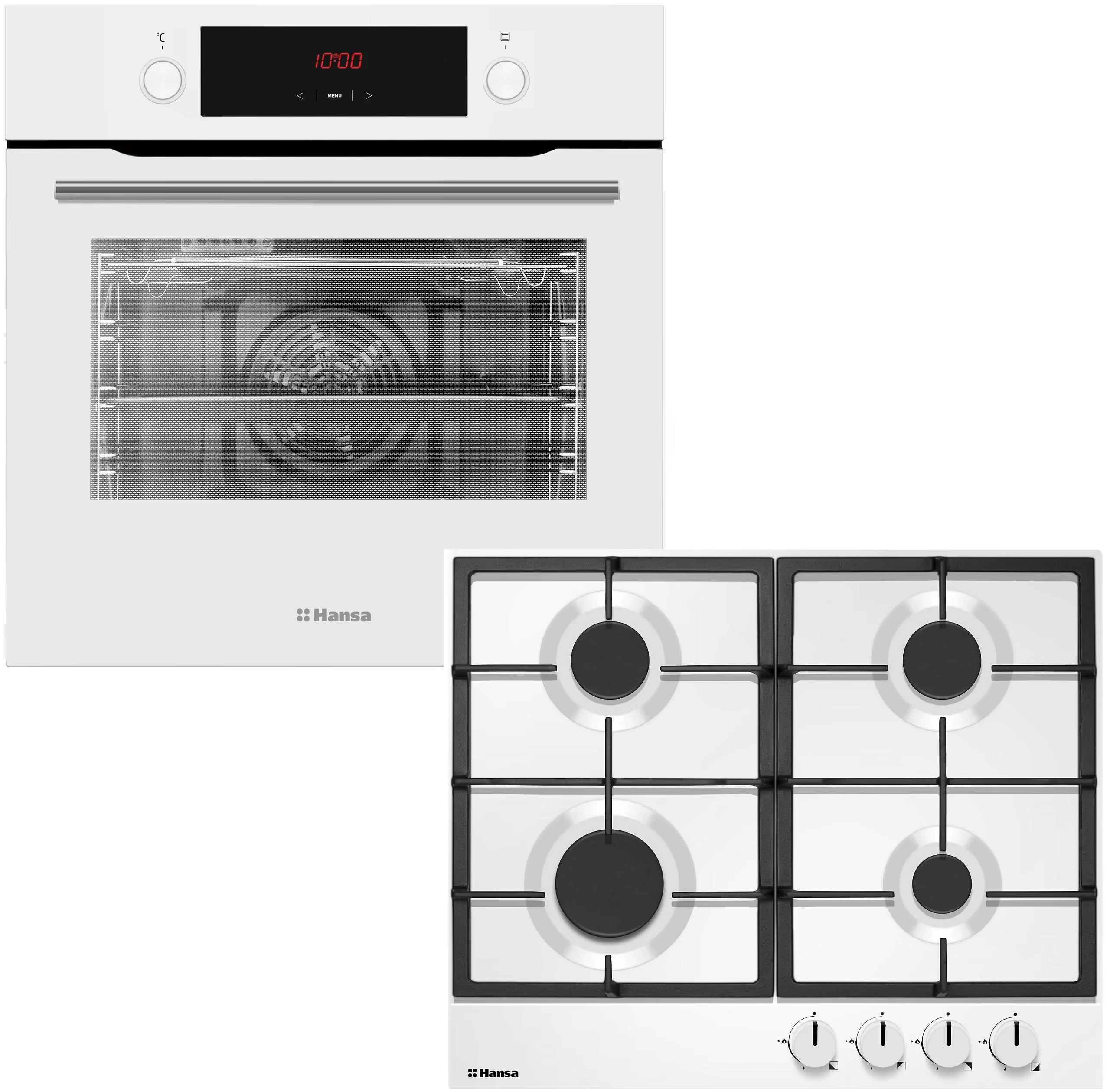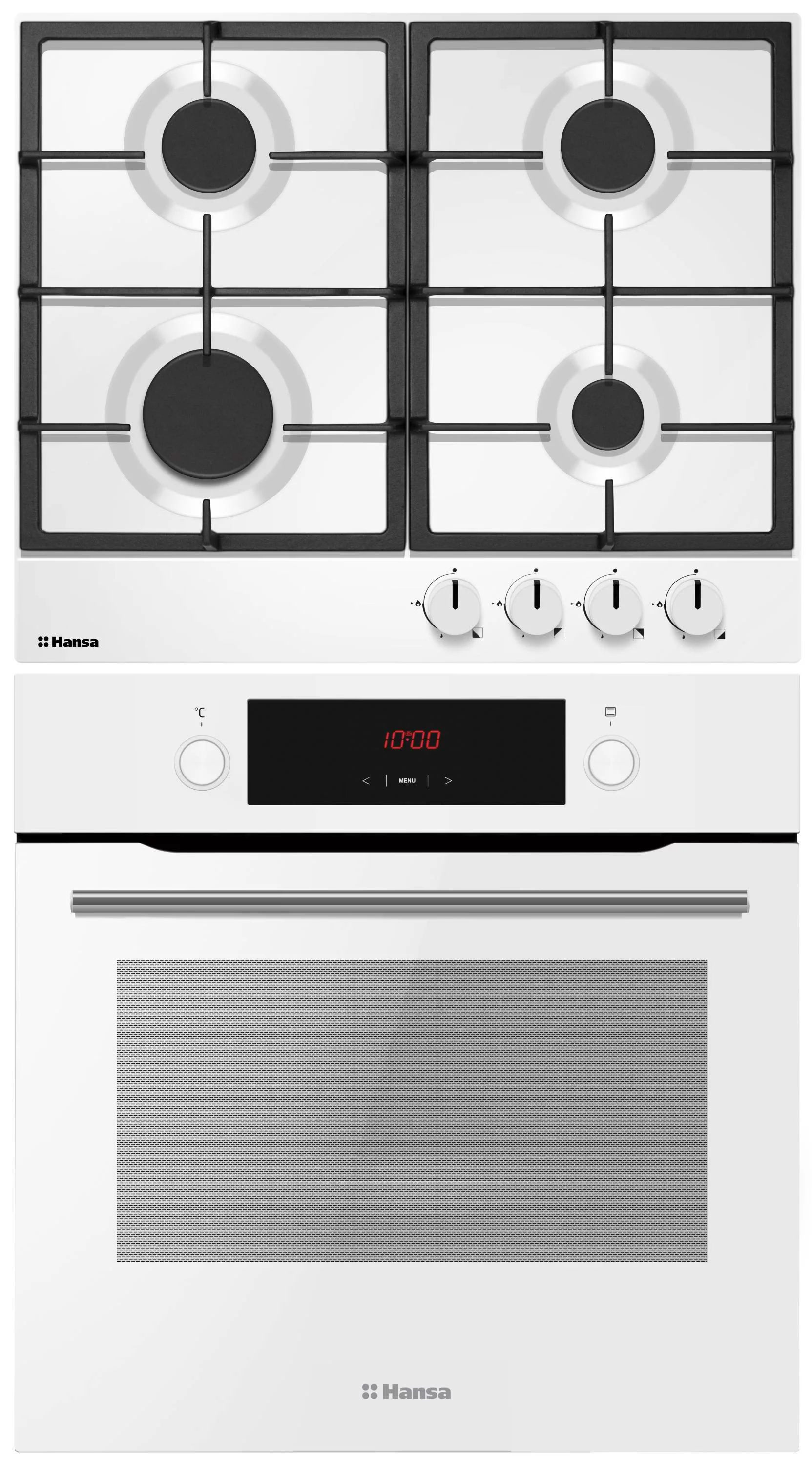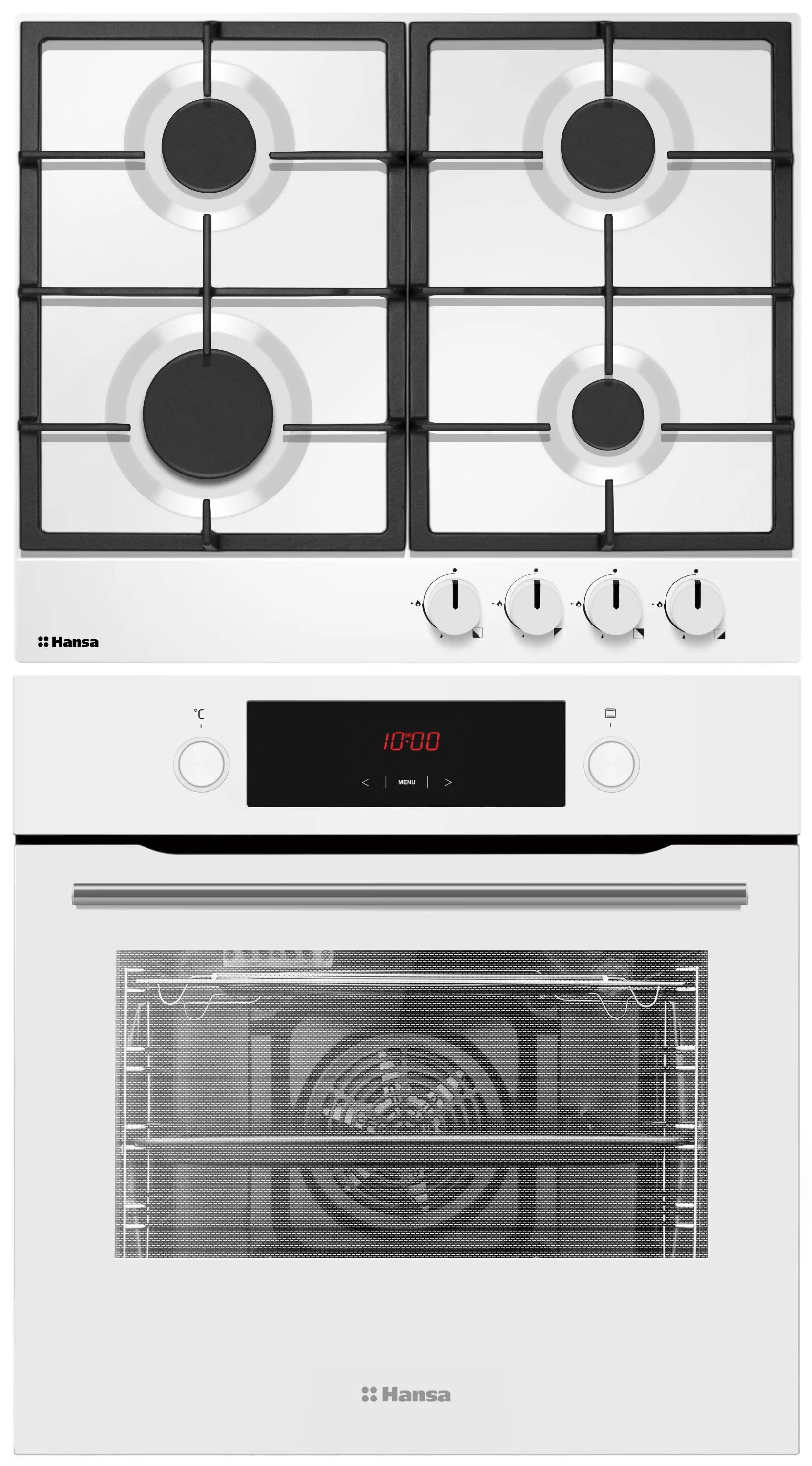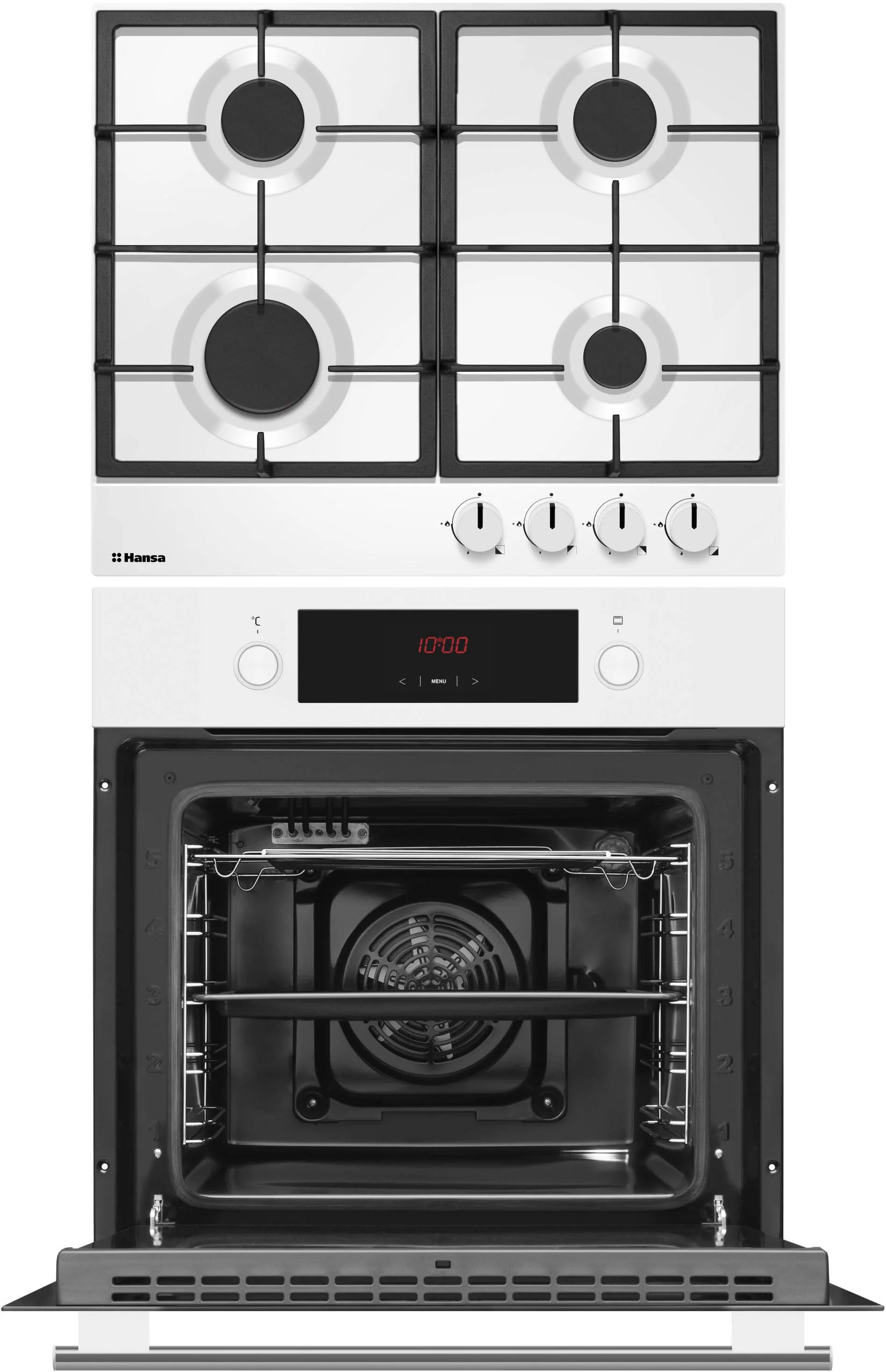 Комплект Hansa FCGW68329 поєднує електричну духовку об’ємом 65 л із 8 режимами приготування, паровим очищенням, грилем і конвекцією та білу газову варильну поверхню з емальованої сталі. Духовка оснащена подвійним склом із рефлексним внутрішнім, галогенним підсвічуванням і сенсорним керуванням у поєднанні з ручками.
