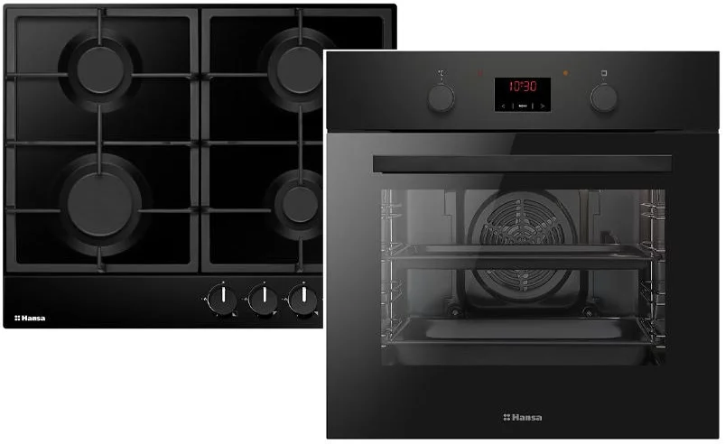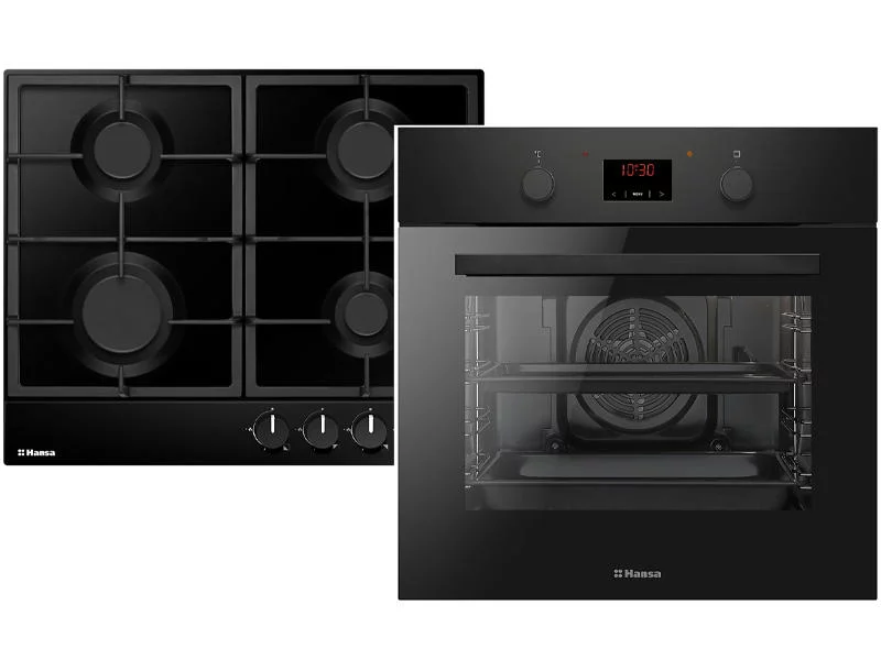 Комплект Hansa FCGS68326 включає електричну духовку об’ємом 65 л із 8 режимами приготування, паровим очищенням, грилем, конвекцією та сенсорним керуванням у поєднанні з газовою варильною поверхнею з чавунними решітками. Духовка оснащена трьома шарами скла, внутрішнім рефлексним склом, галогенним підсвічуванням та знімними дверцятами. Газова панель має 4 конфорки італійського виробництва Somipress.