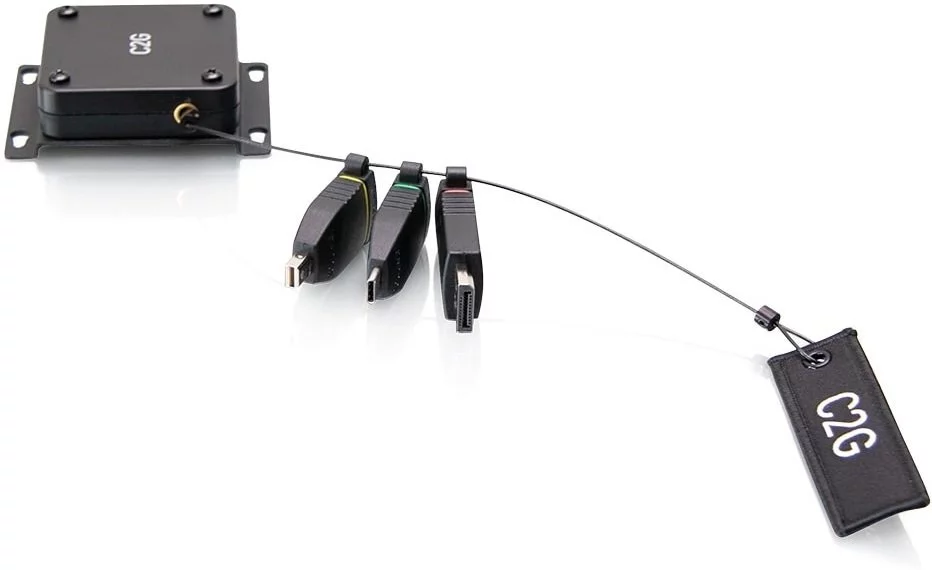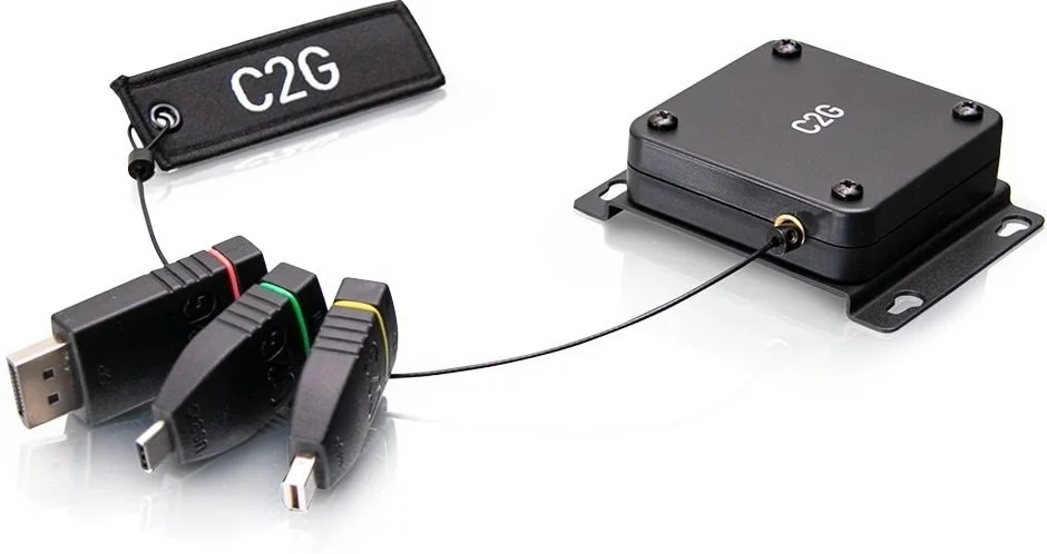 Комплект перехідників retractable C2G Adapter Ring HDMI на mini DP DP USB-C CG84269. Запатентоване універсальне висувне кільце адаптера HDMI 4K - ідеальне доповнення до конференц-залів, переговорних кімнат, лекційних залів або класних кімнат, щоб кожен міг підключитися. Стандартна конфігурація включає адаптери для підключення практично будь-якого пристрою до дисплея з роздільною здатністю відео до 4K. Стандартна конфігурація включає адаптери HDMI-DisplayPort, Mini DisplayPort або USB-C для вирішення проблем із підключенням.