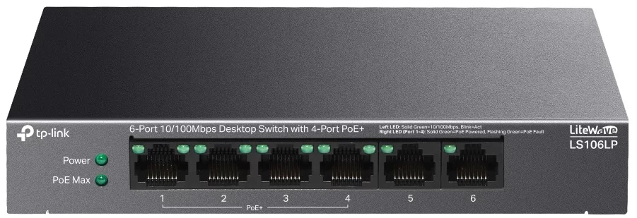TP-LINK LS106LP – 6-портовий некерований комутатор Fast Ethernet із 4 портами PoE+ (802.3af/at). Забезпечує загальний бюджет живлення 41 Вт і до 30 Вт на порт. Підтримує режим розширення з передачею даних і живленням на відстань до 250 м.