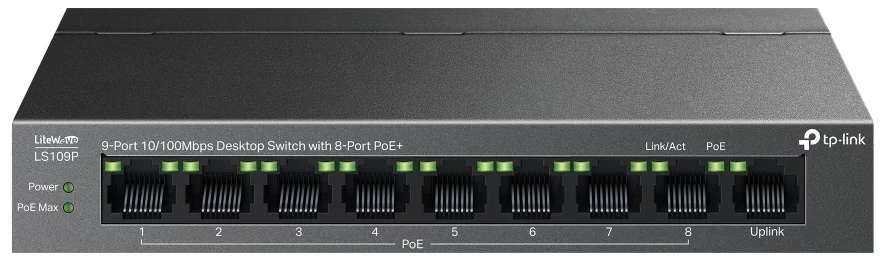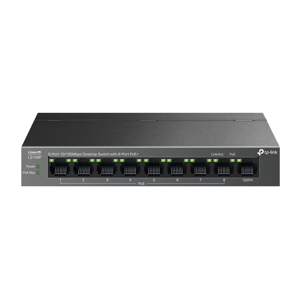 TP-LINK LS109P – 9-портовий некерований комутатор з 8 портами PoE+ і бюджетом живлення 63 Вт. Кожен порт підтримує до 30 Вт, що дозволяє підключати IP-камери, точки доступу та інші пристрої. Має режим розширення для передачі PoE на відстань до 250 м, функцію автоматичного відновлення та ізоляції трафіку.