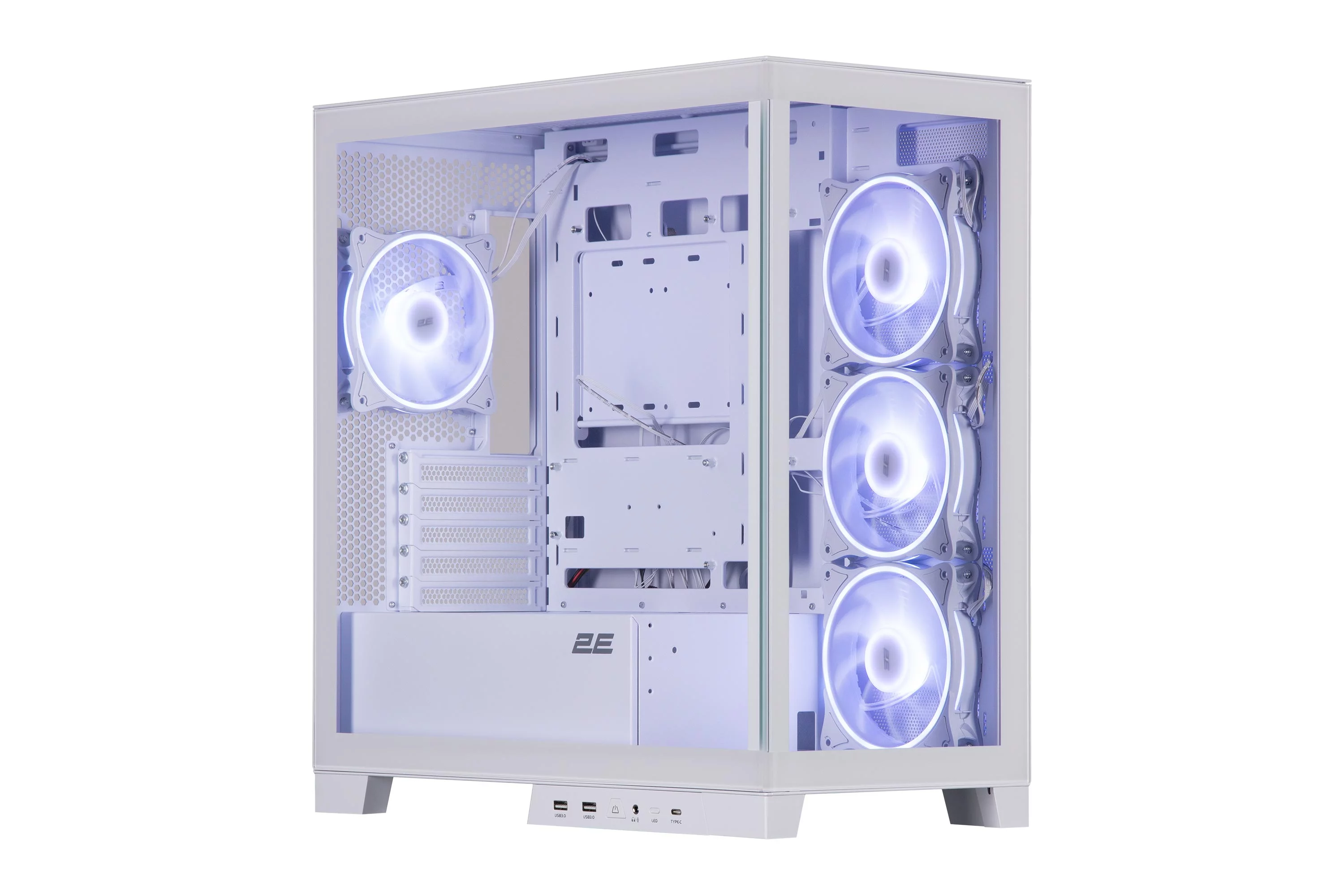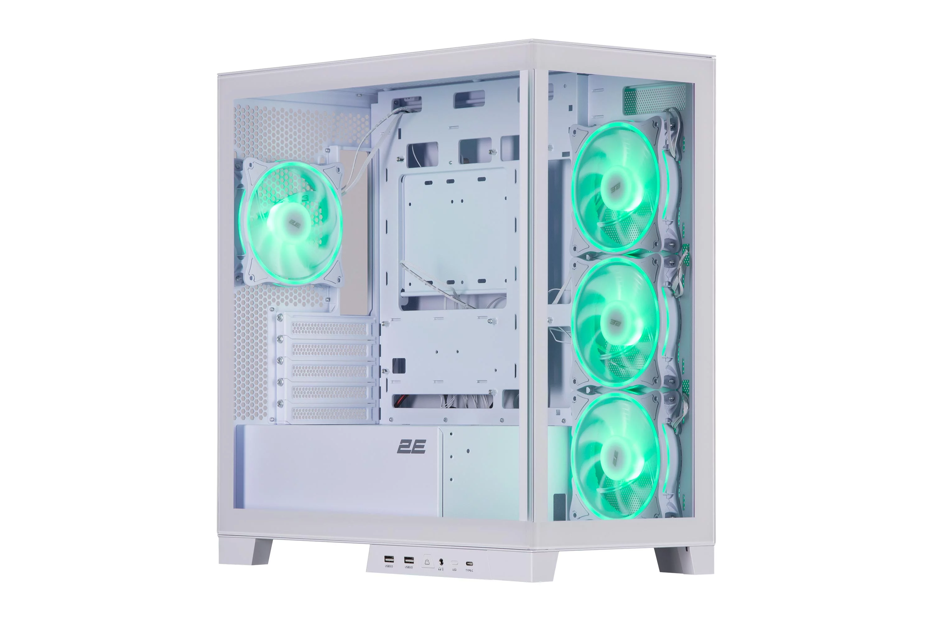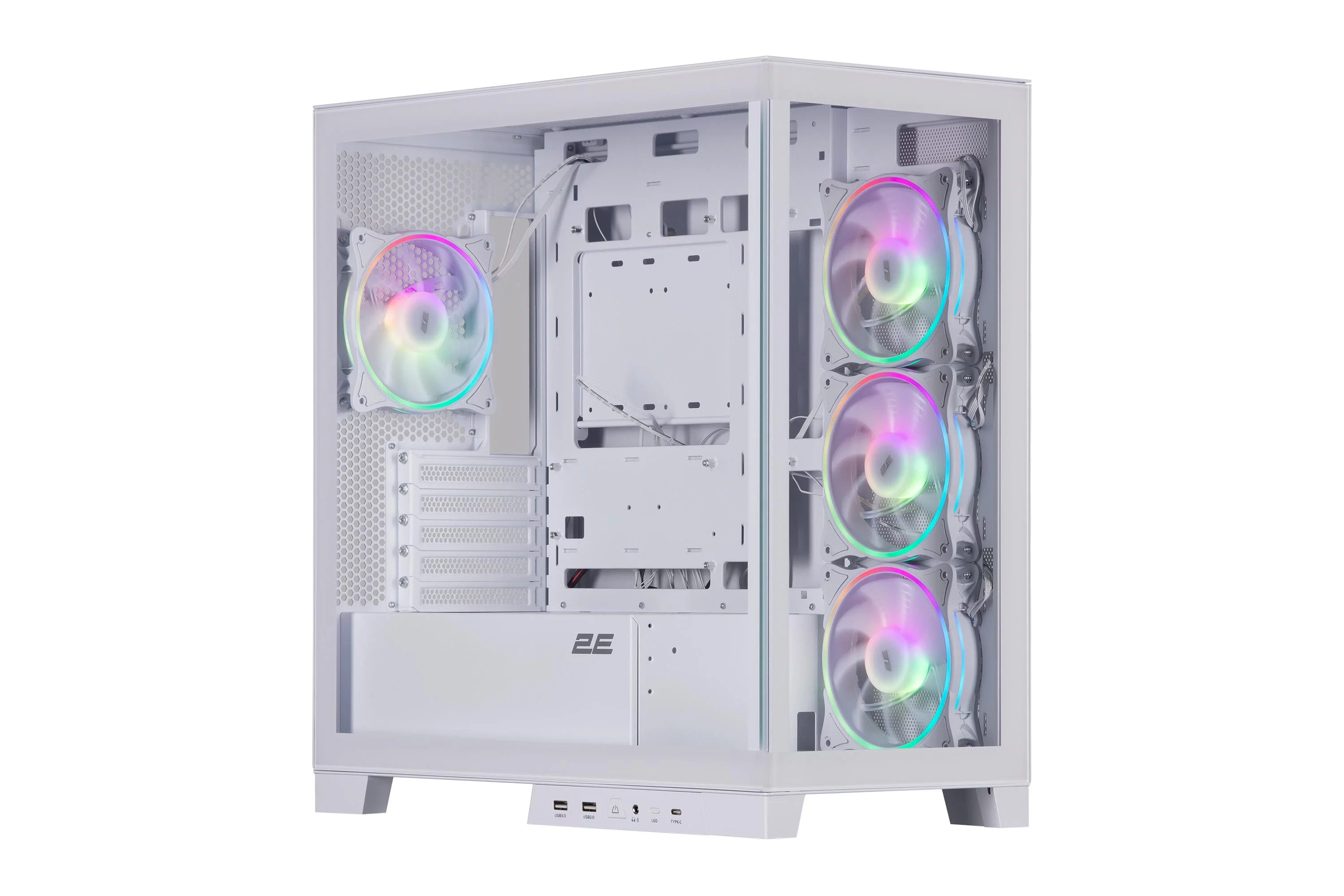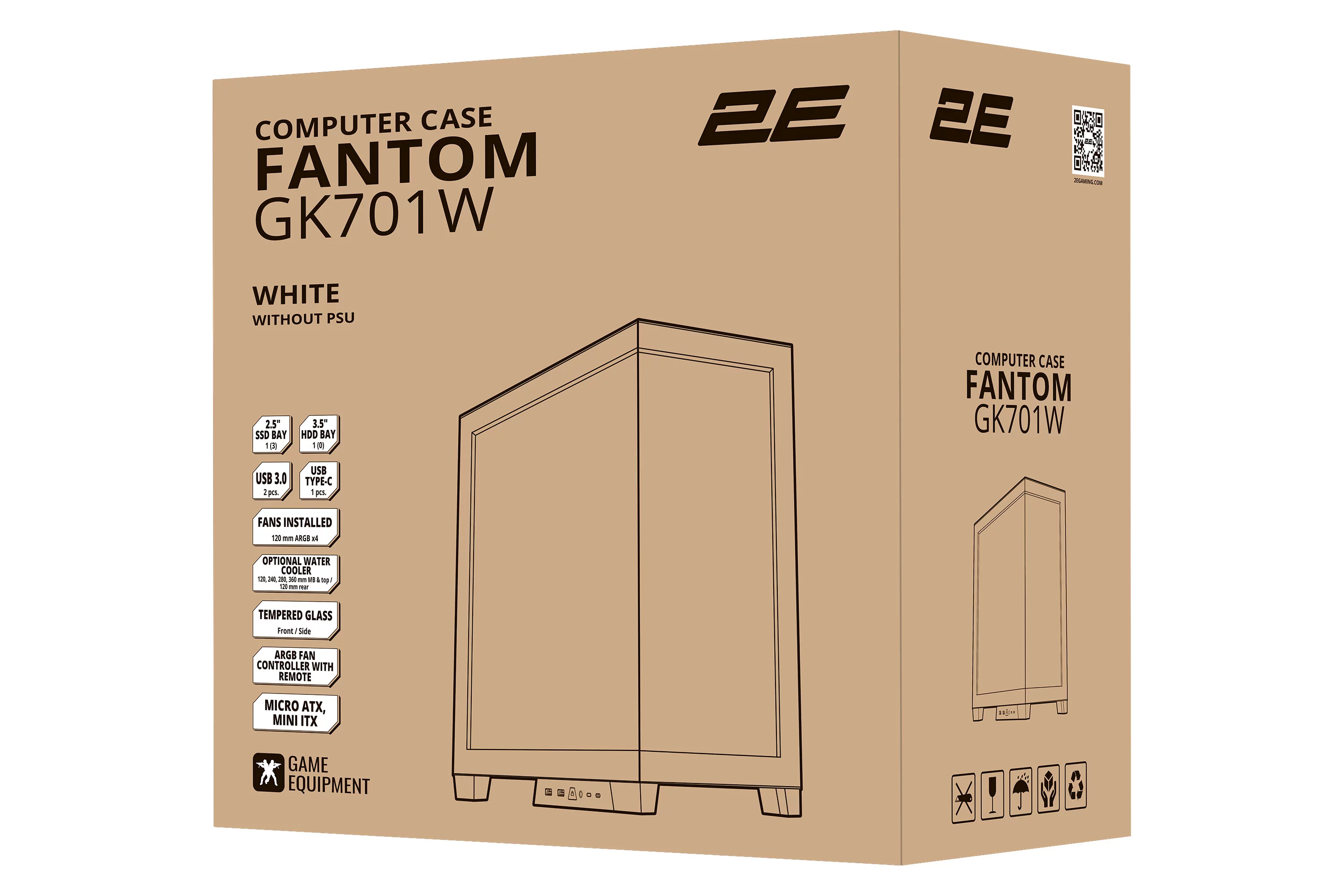 Корпус 2E GAMING Fantom GK701W, компактний корпус з металу і загартованого скла. Відмінно підходить для створення прозорої комп'ютерної системи з акцентом на підсвічені деталі компонентів. В комплекті: 4 вбудованих 120мм ARGB PWM вентилятора (на внутрішній панелі поруч з материнською платою і на задній панелі), контролер і дистанційний пульт для управління.