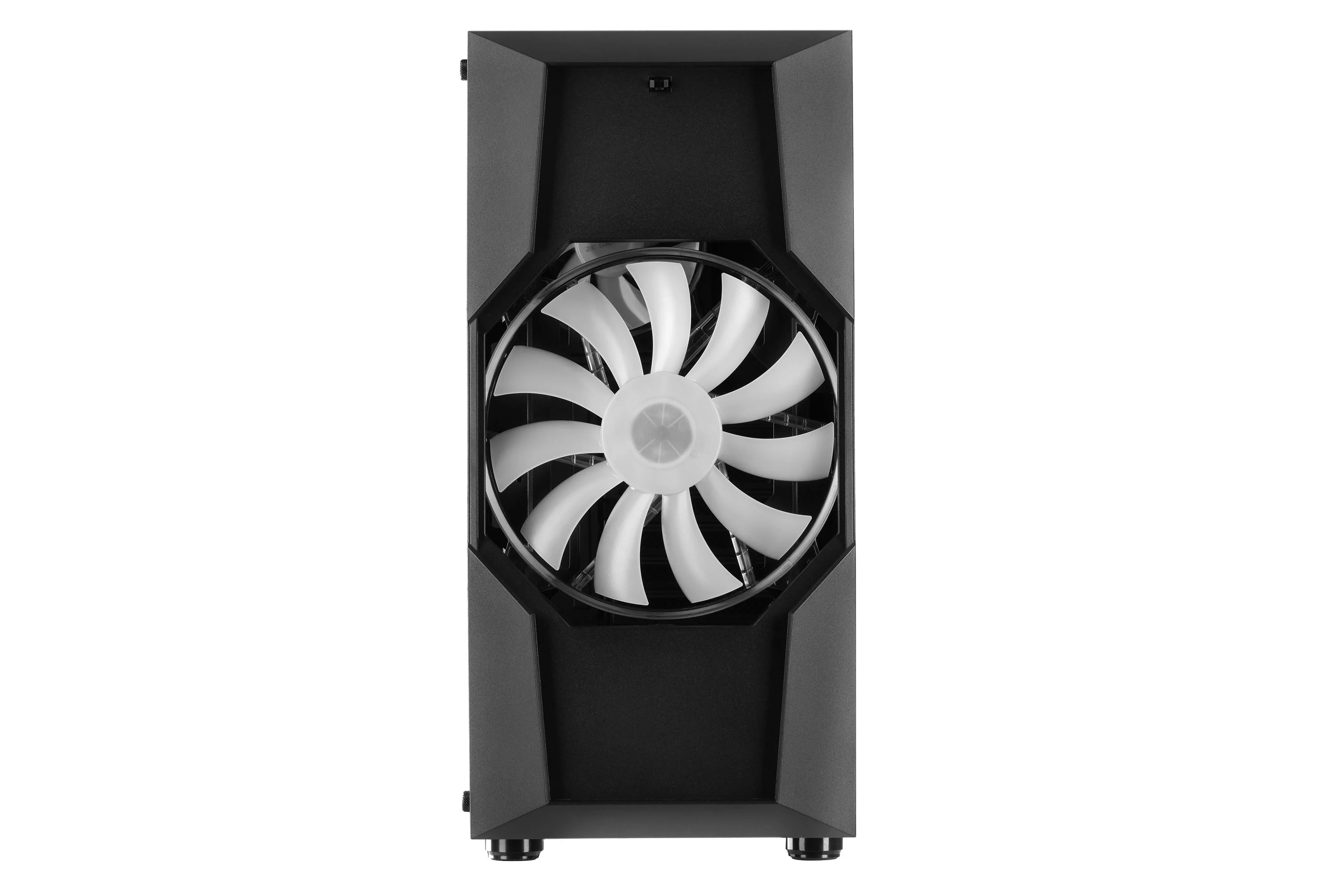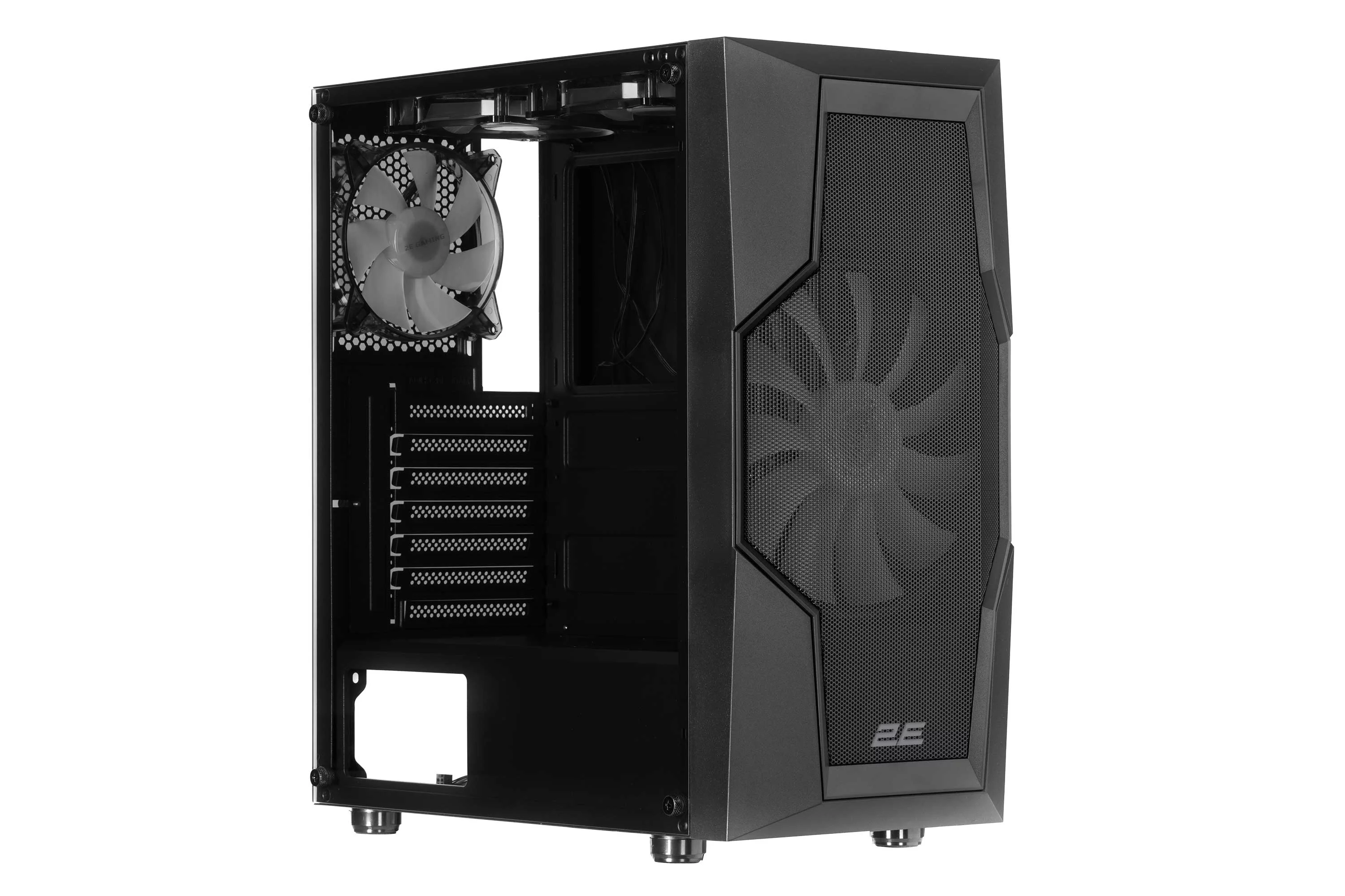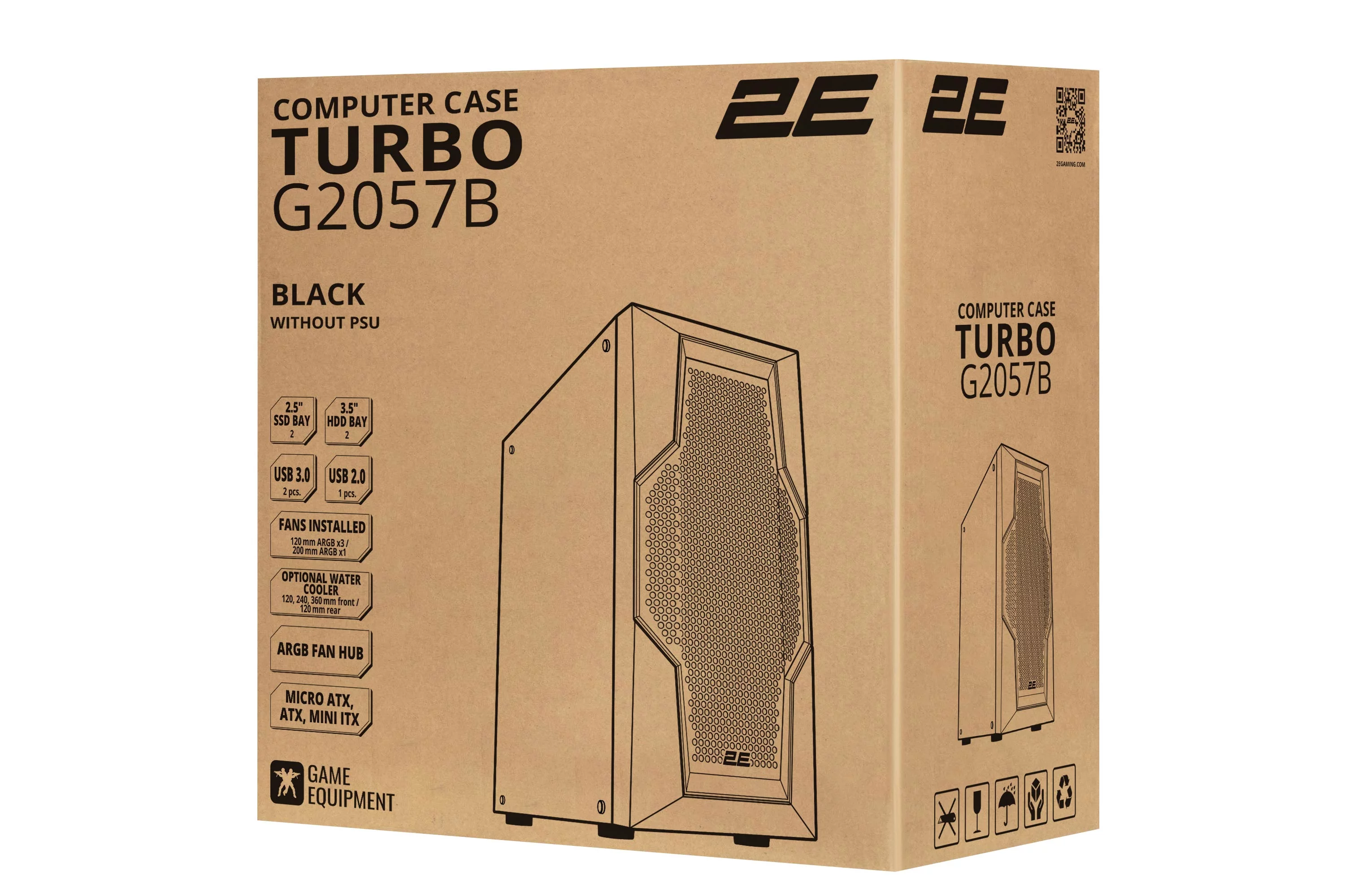 Корпус 2E GAMING Tubo G2057B чорний з 200 мм ARGB вентилятором за сітчастою лицьовою панеллю та додатково двома 120мм ARGB вентиляторами на верхній та одним 120мм ARGB вентилятором на задній панелях. Модель відмінно підійде для самостійного та промислового складання завдяки раціонально організованому внутрішньому простору і не складній конструкції.