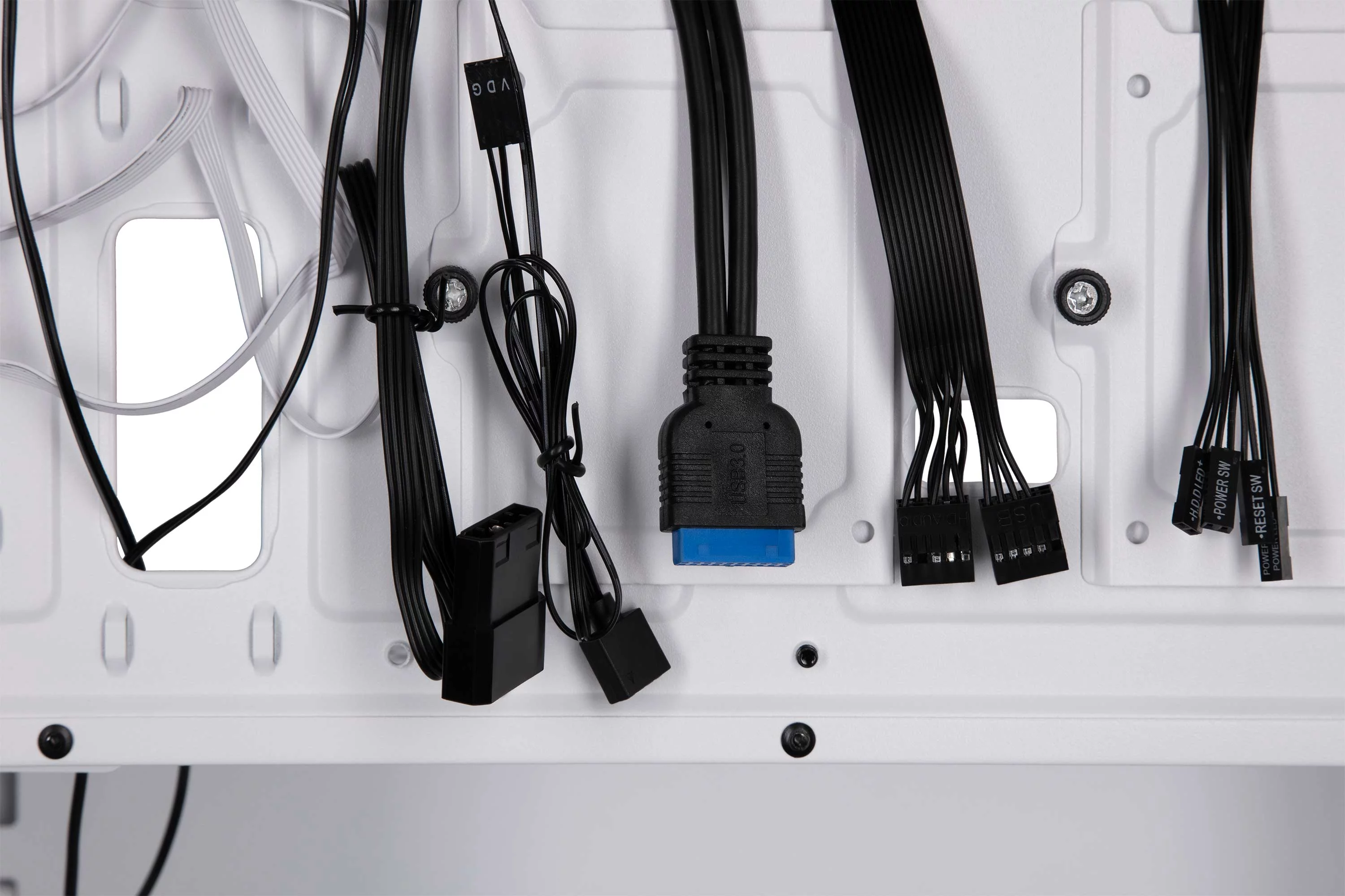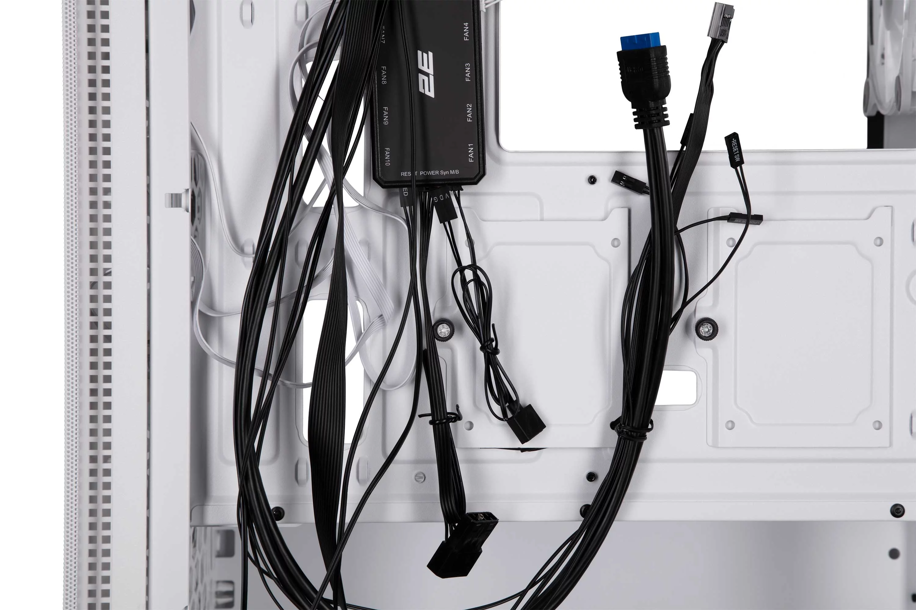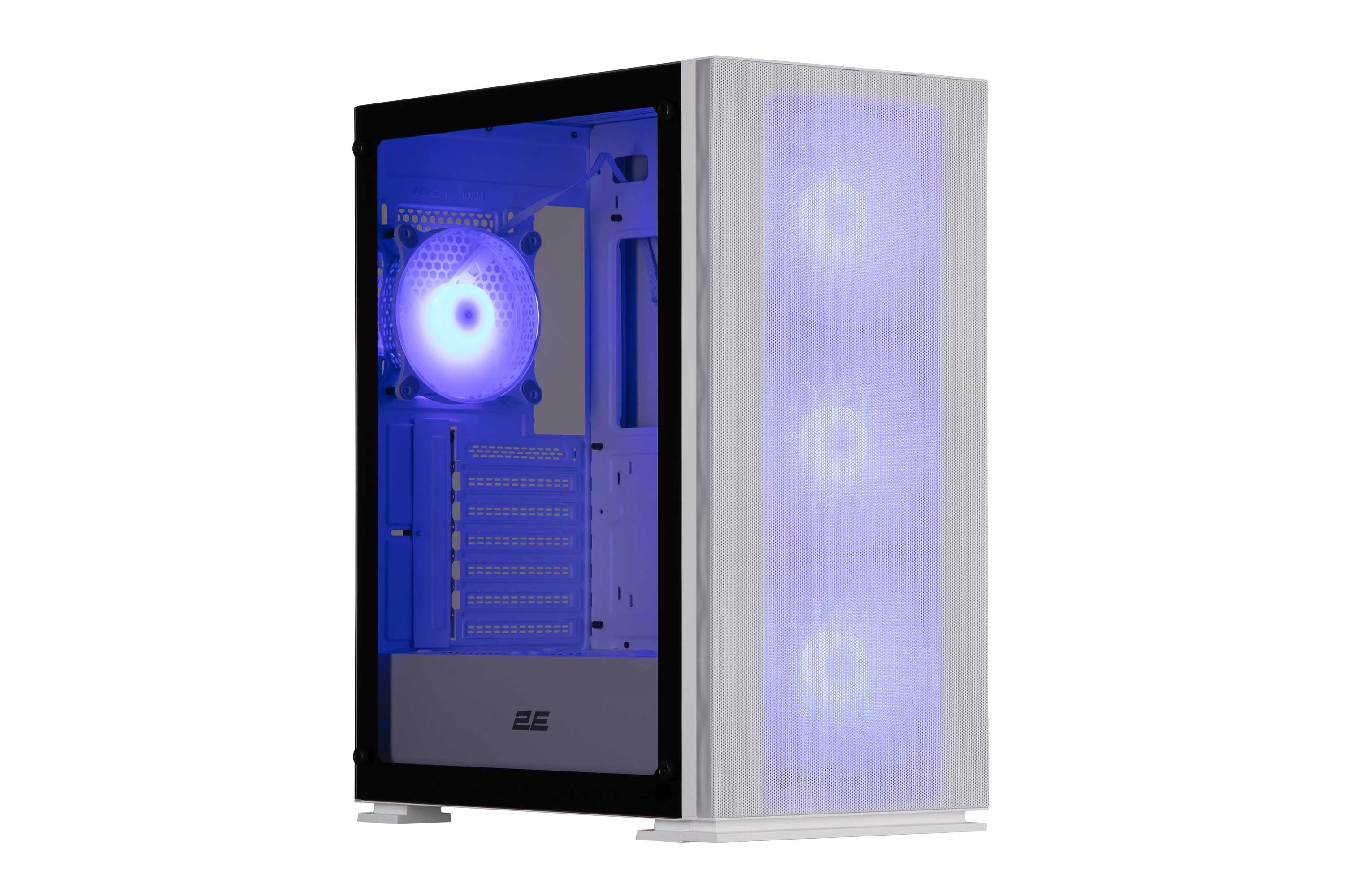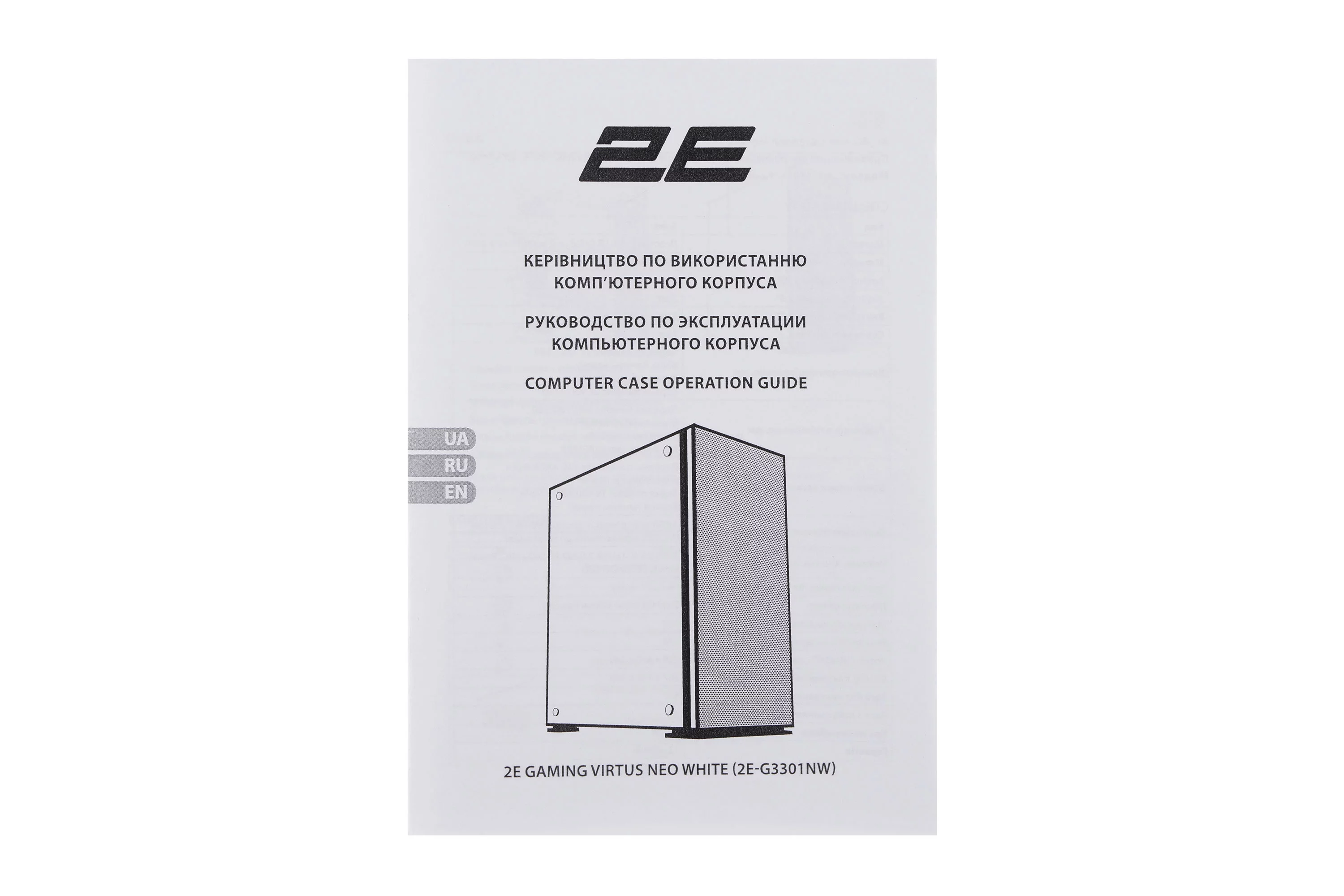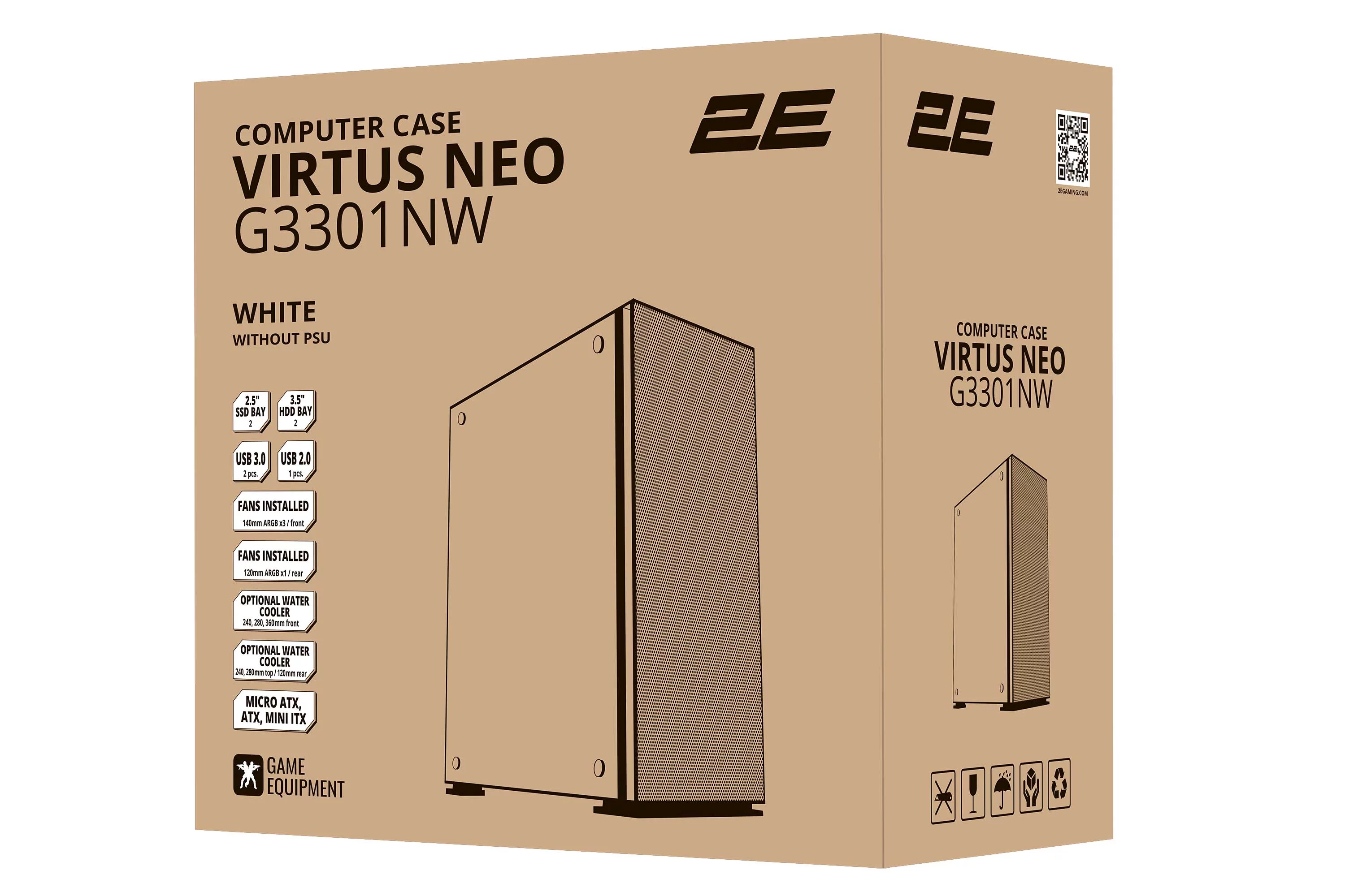 Корпус 2E GAMING Virtus Neo G3301NW, з трьома вбудованими 140мм ARGB вентиляторами за панеллю із металевої сітки та 120мм ARGB вентилятором на задній панелі. Модель відмінно підходить для самостійної та промислової збірки, завдяки раціонально організованому внутрішньому простору та нескладній конструкції. Вентилятори підключені до контролера з дистанційним пультом.