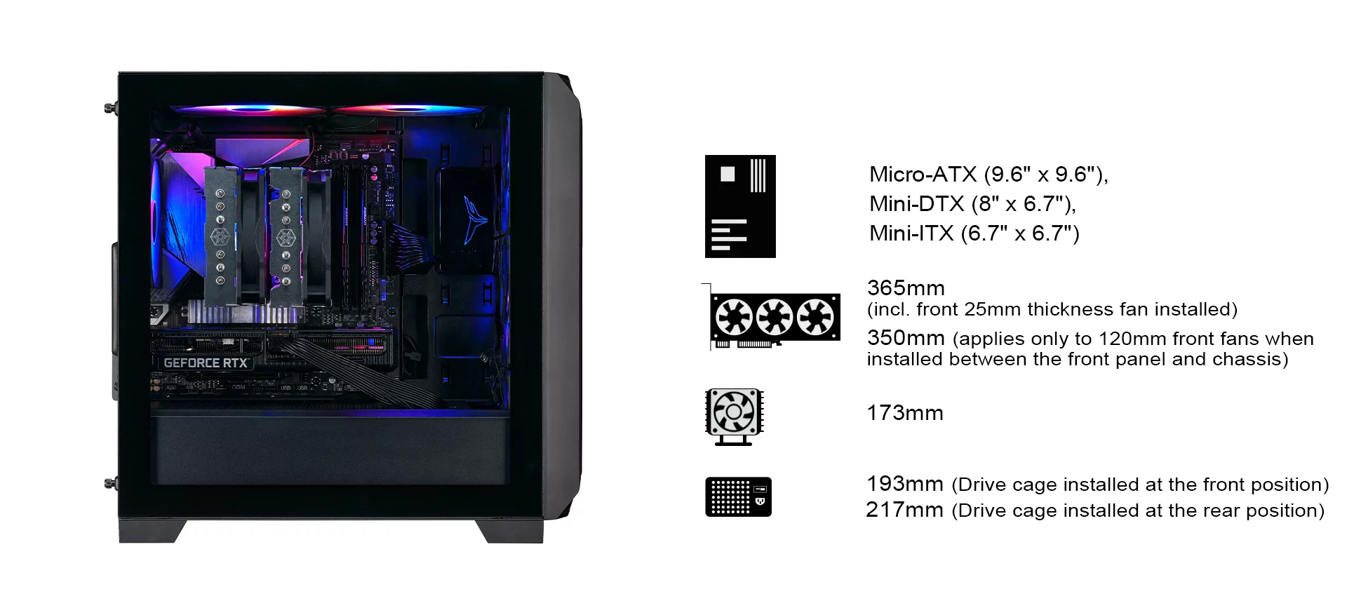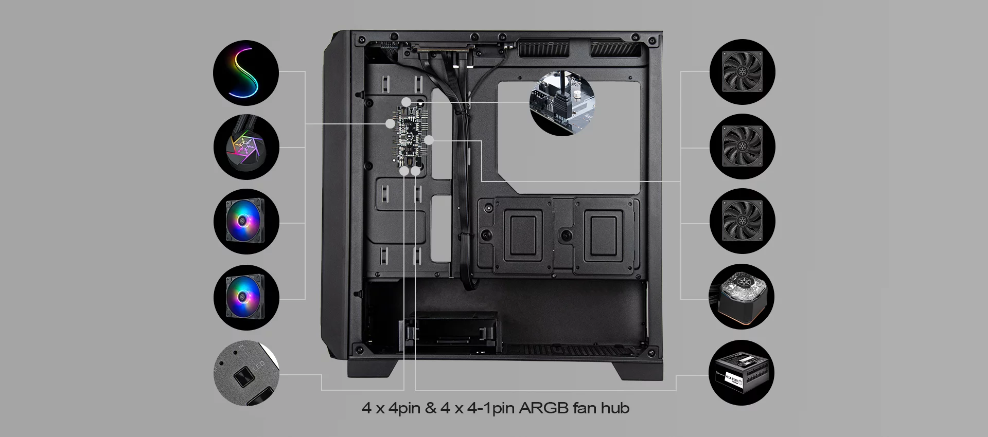 Задня панель: 1x 120мм, 2 x 120 мм на верхній панелі, 2 x 140 мм на верхній панелі, 2 x 140 мм спереду, 3 х 120 мм спереду